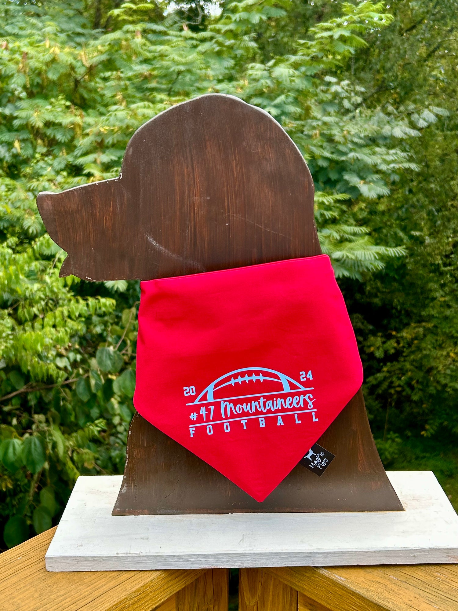 This bandana is a red bandana with a light blue football, 2024, and the word football printed on it. You can also personalize the center of this bandana with a number, name, etc.