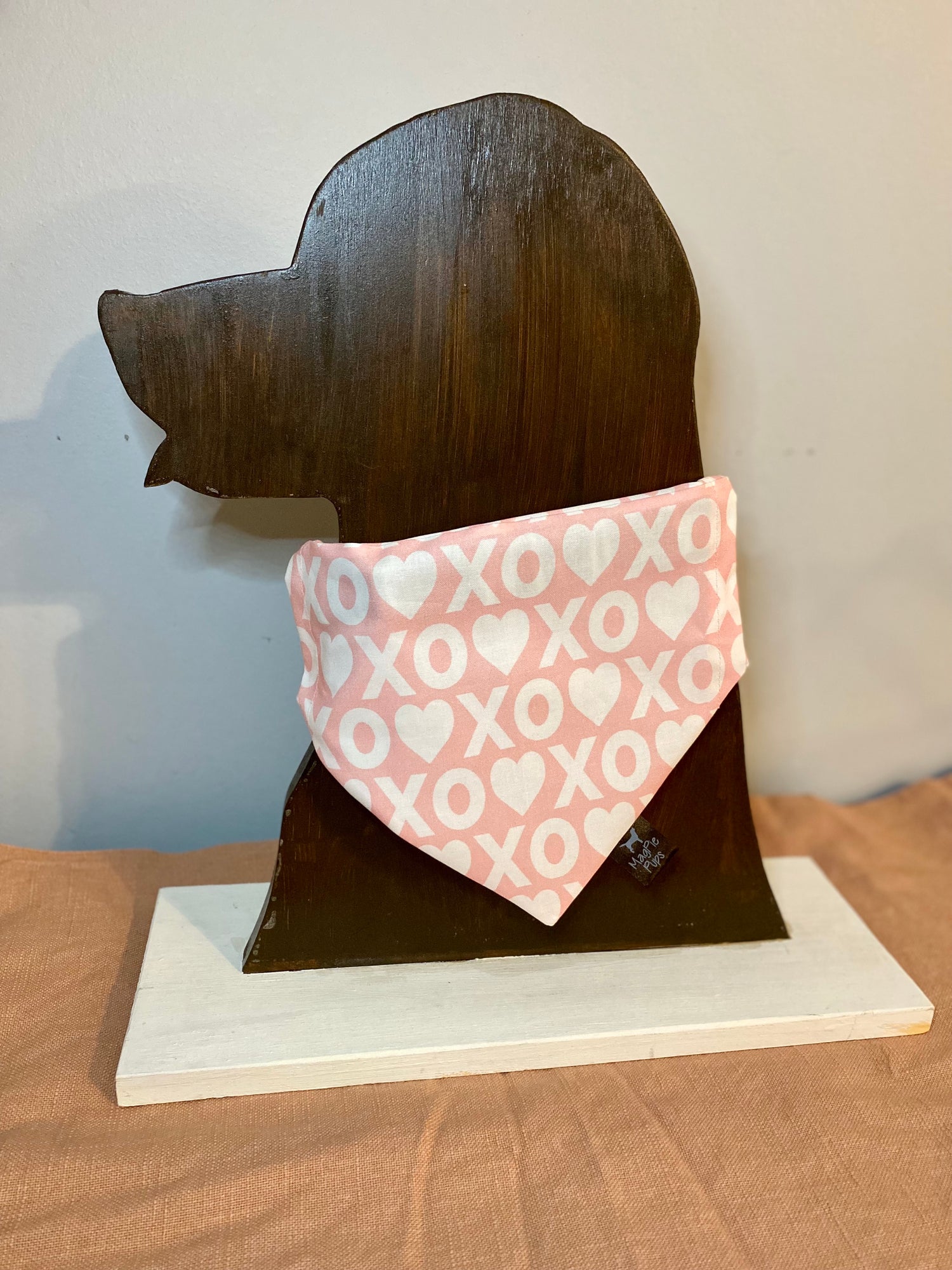 This bandana is a blush pink bandana with XO and hearts printed on it in white.