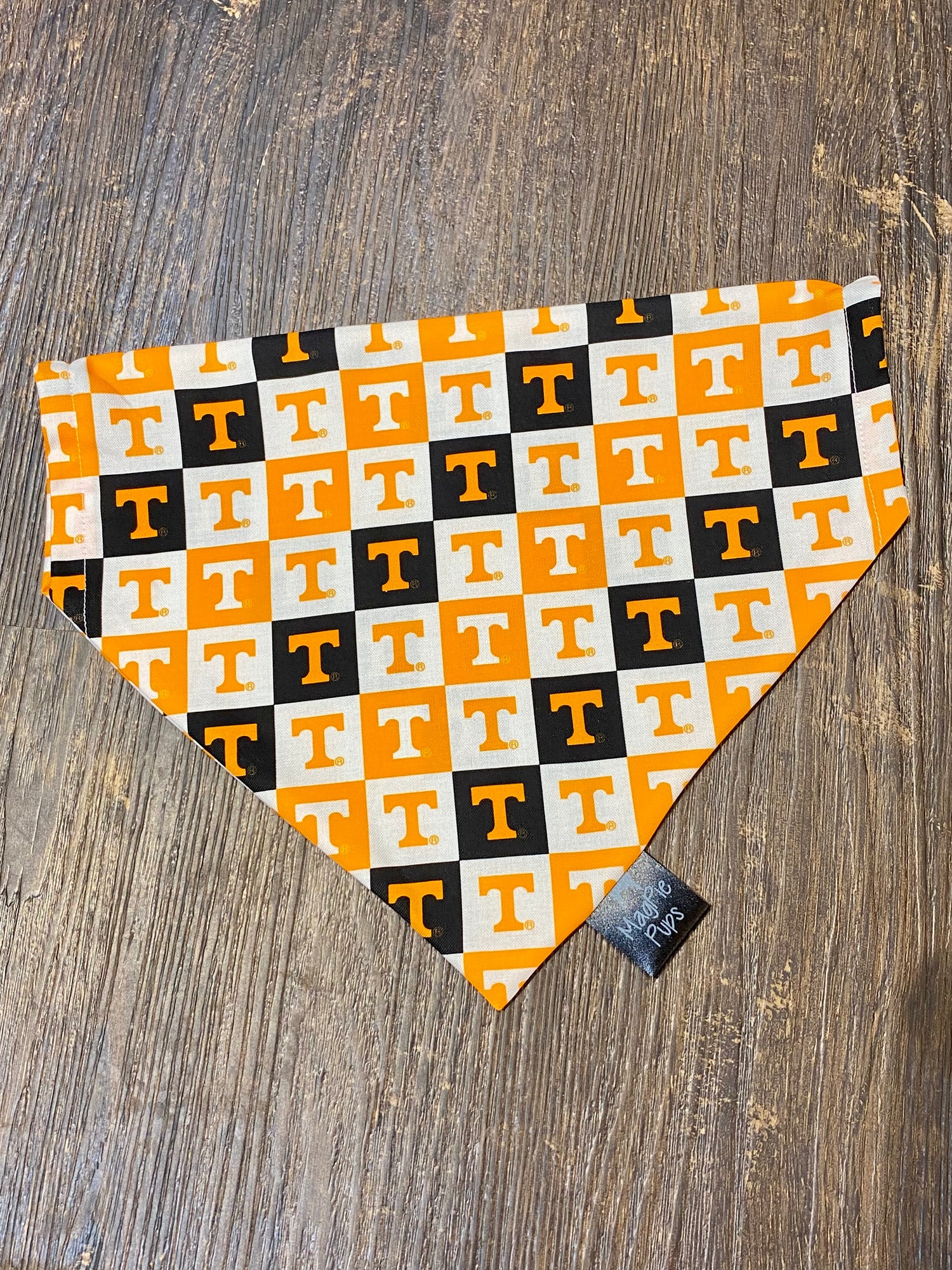 This bandana is a black, white and orange checkerboard bandana with the Power T printed on it.