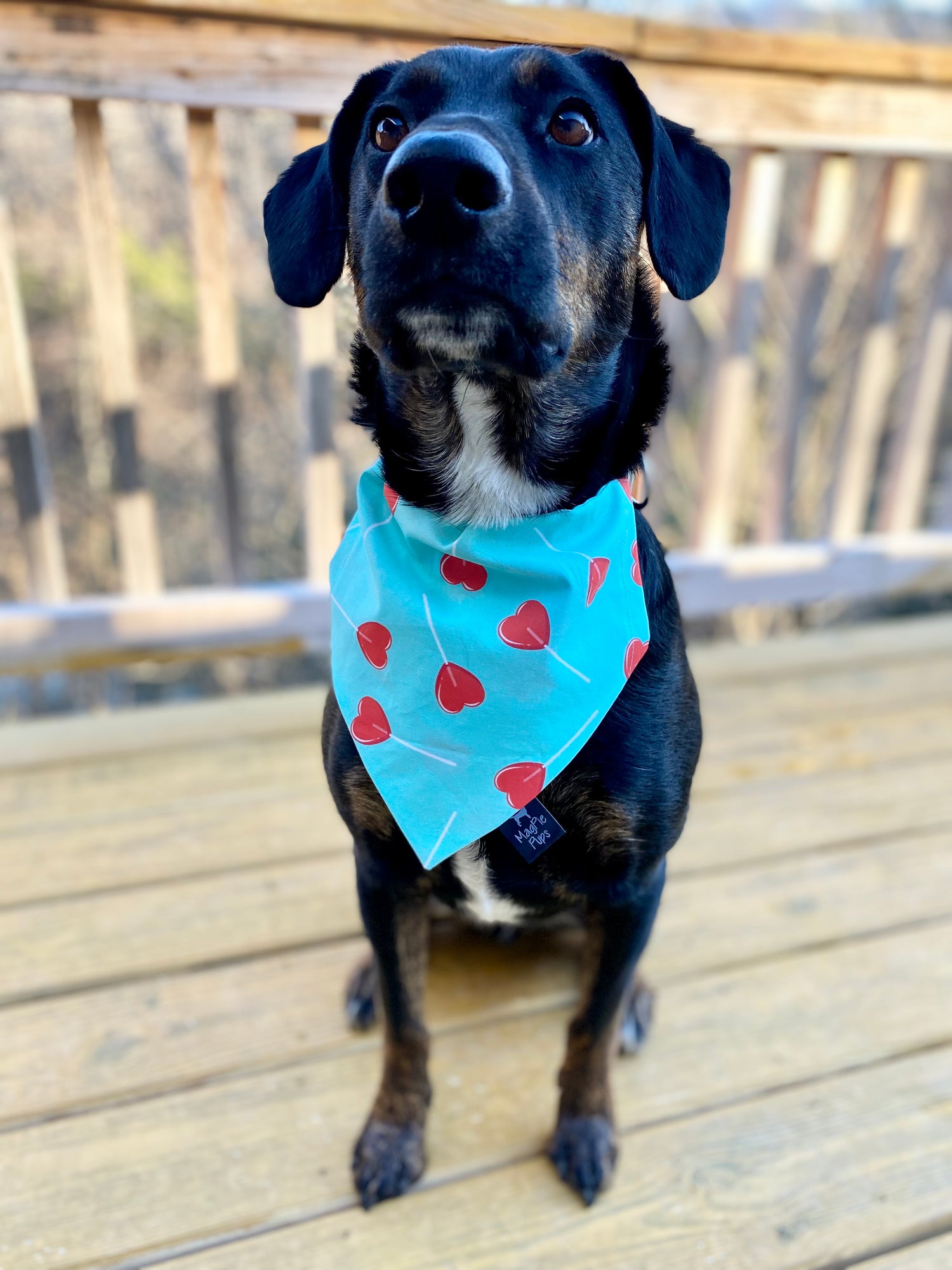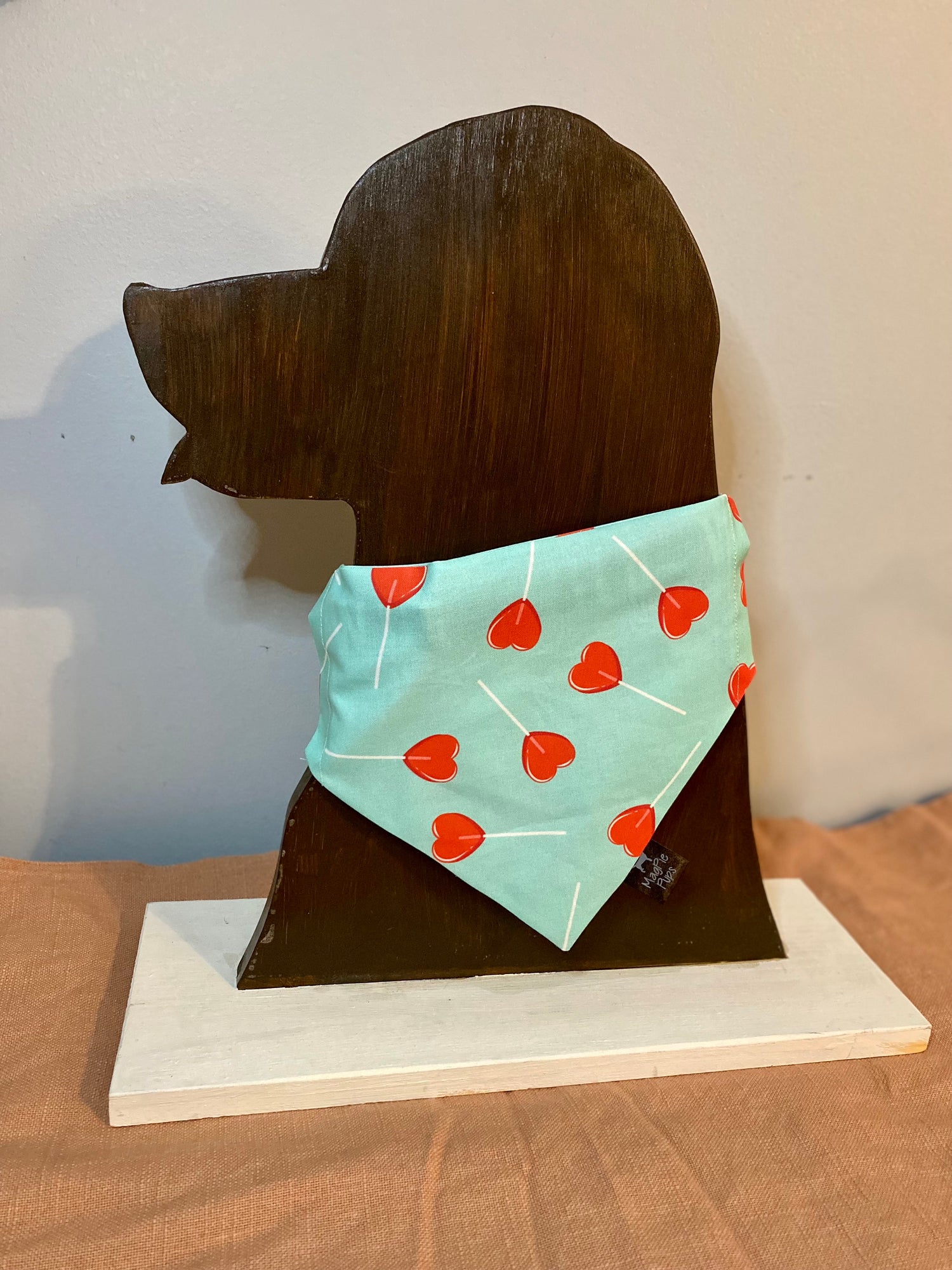 This bandana is a mint green bandana with red heart suckers printed on it.