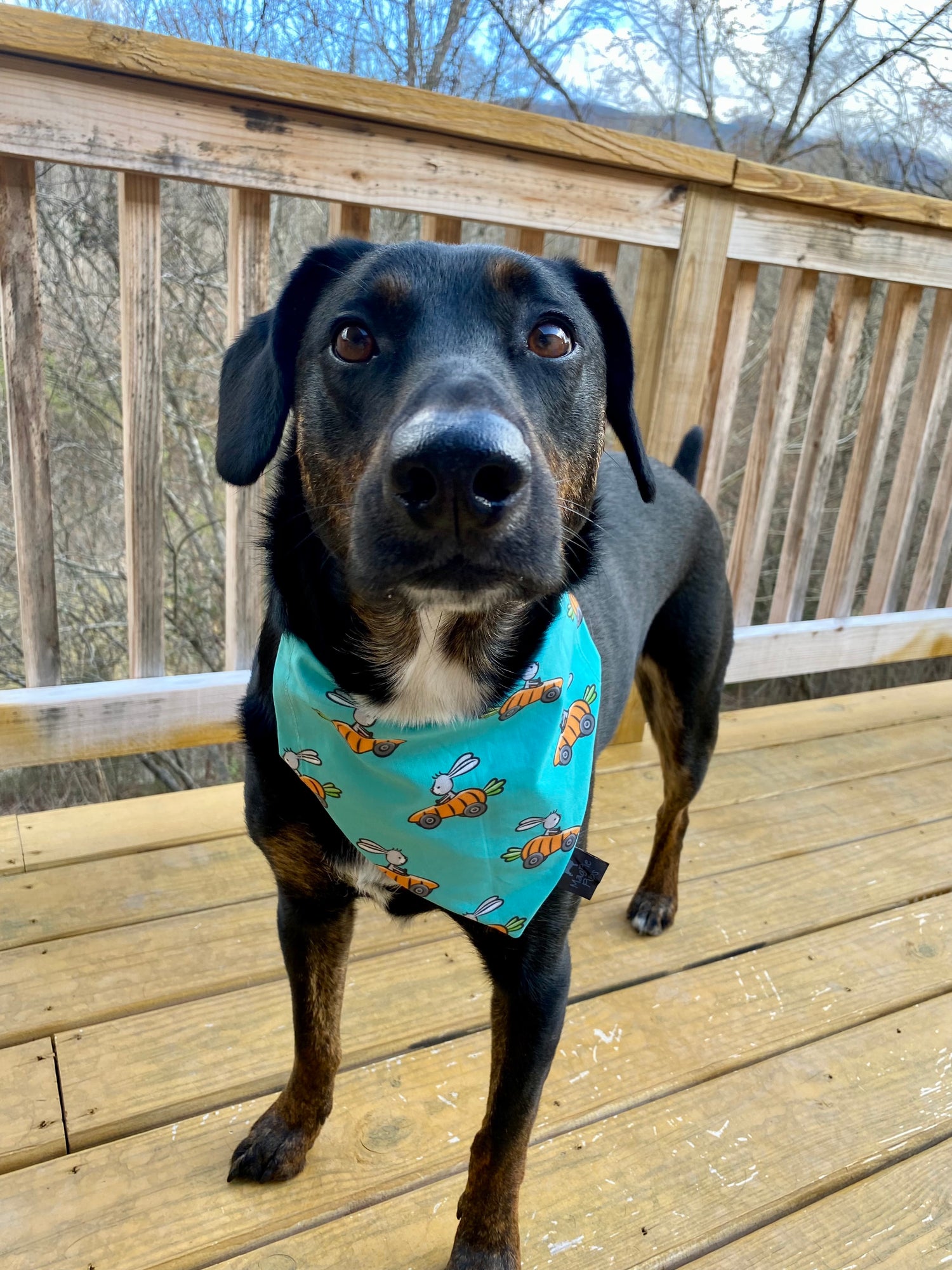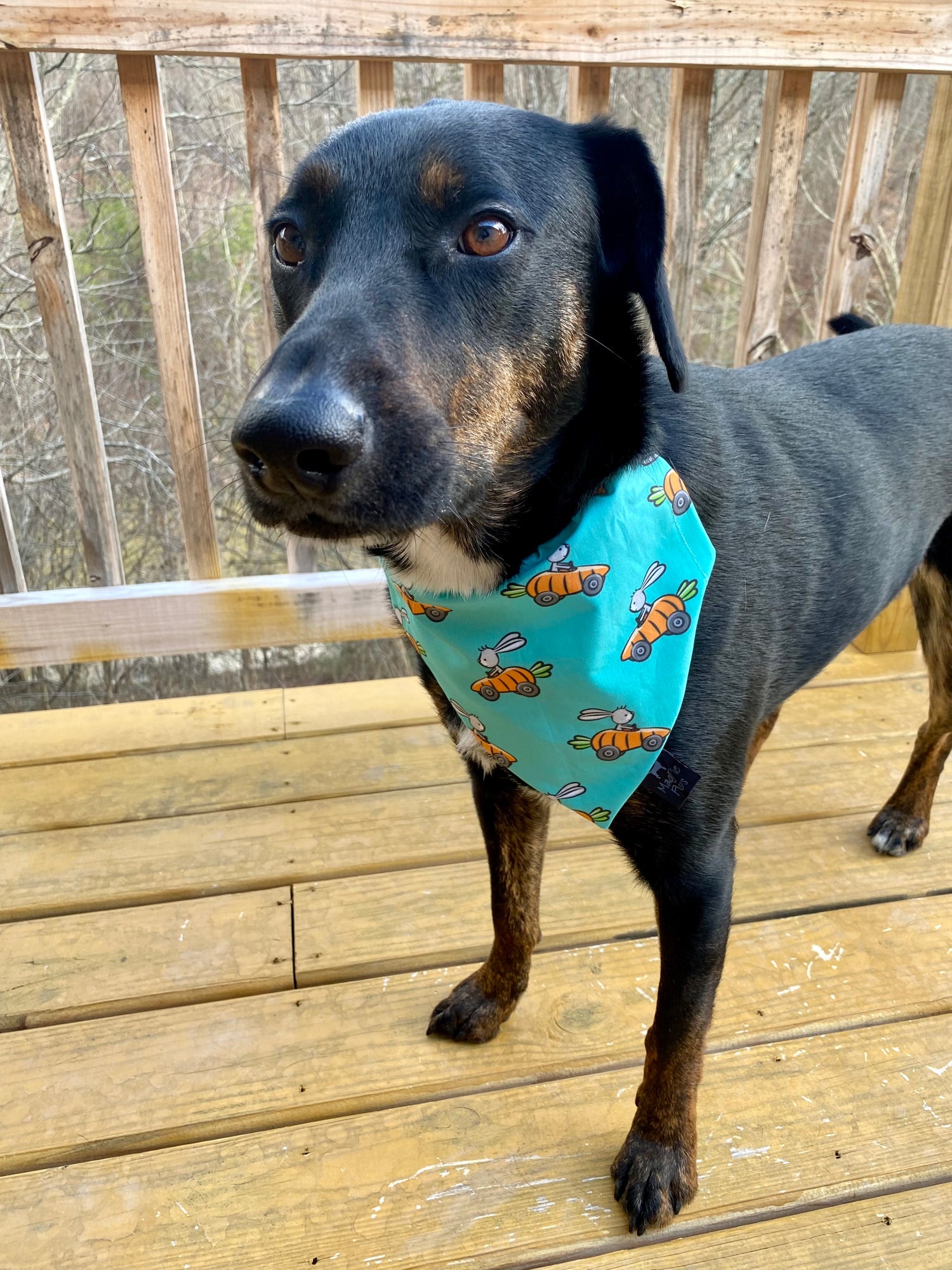 This over the collar bandana is a teal green bandana with bunnies in carrot race cars printed on it.