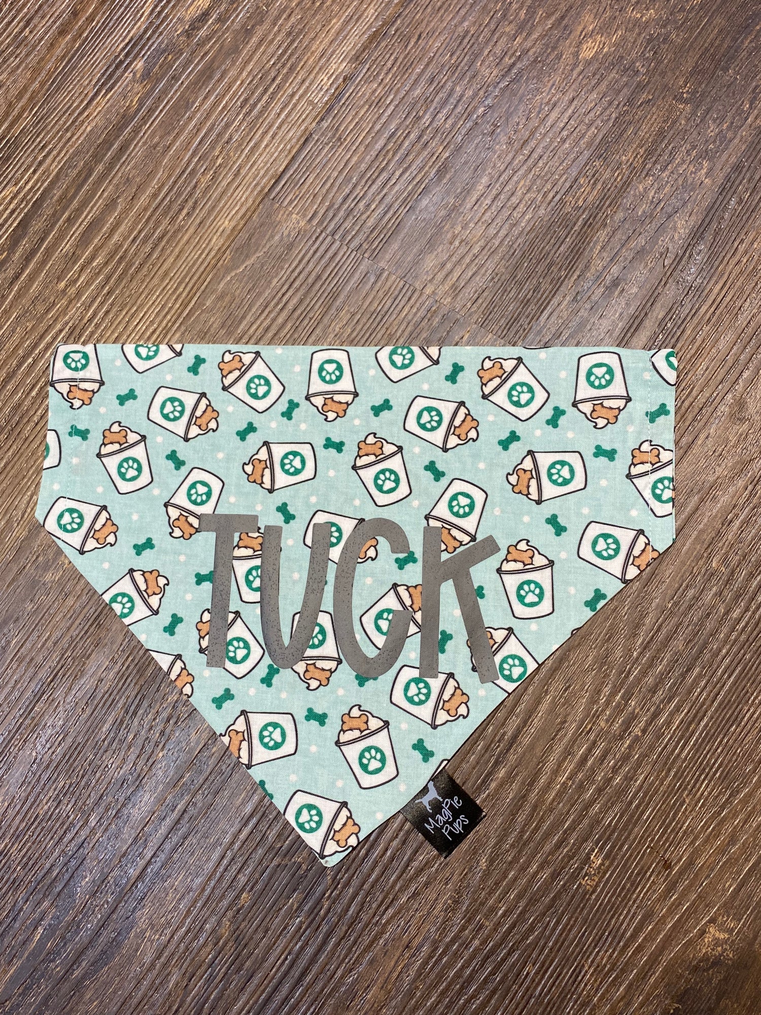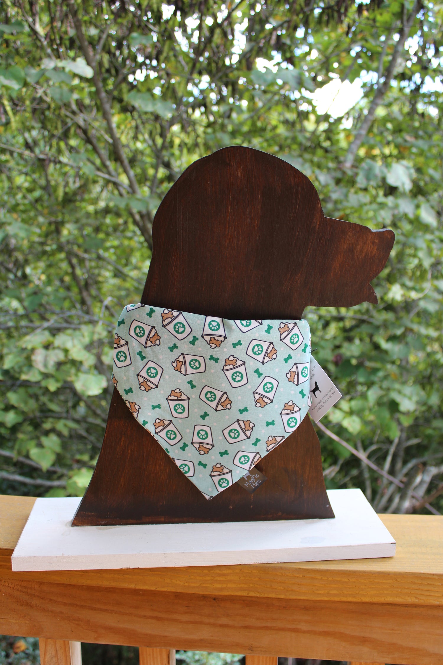 This bandana is a mint green/blue bandana with paw print puppuccino coffee cups printed on it.