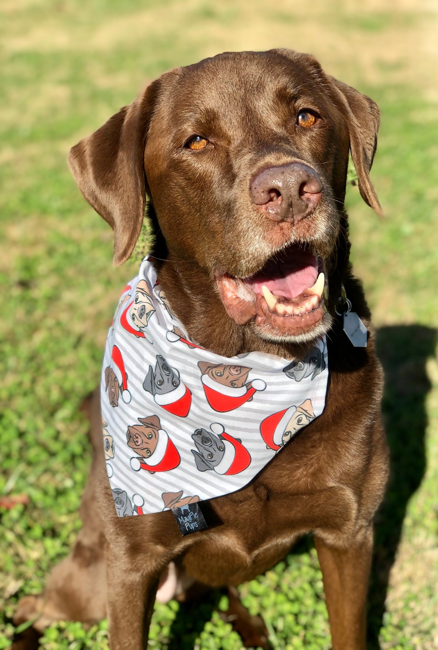 This bandana is a grey and white bandana with black, chocolate, and yellow Labrador faces wearing Santa hats on it.