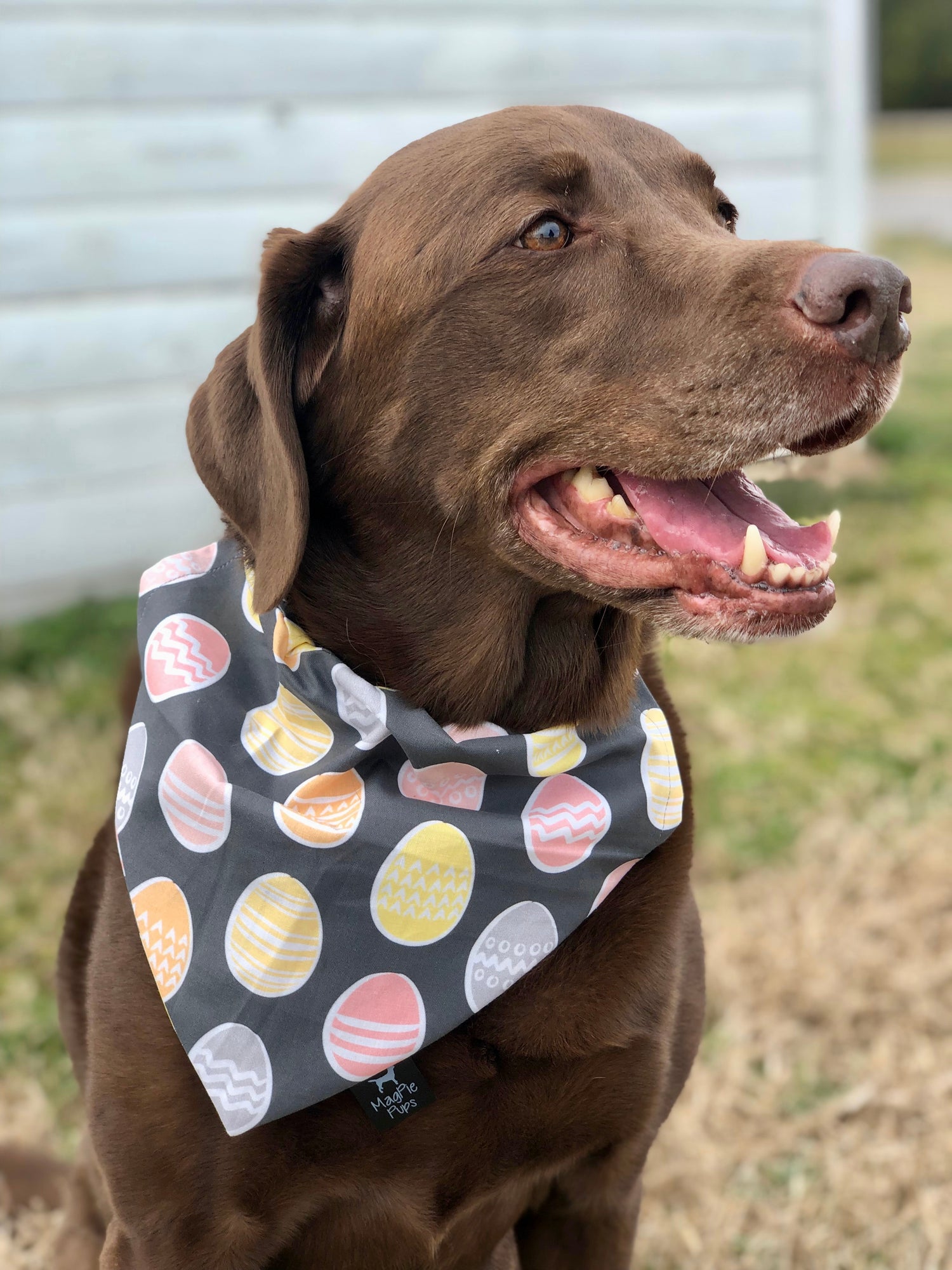 This over the collar bandana is a dark grey bandana with pastel colored eggs printed on it.