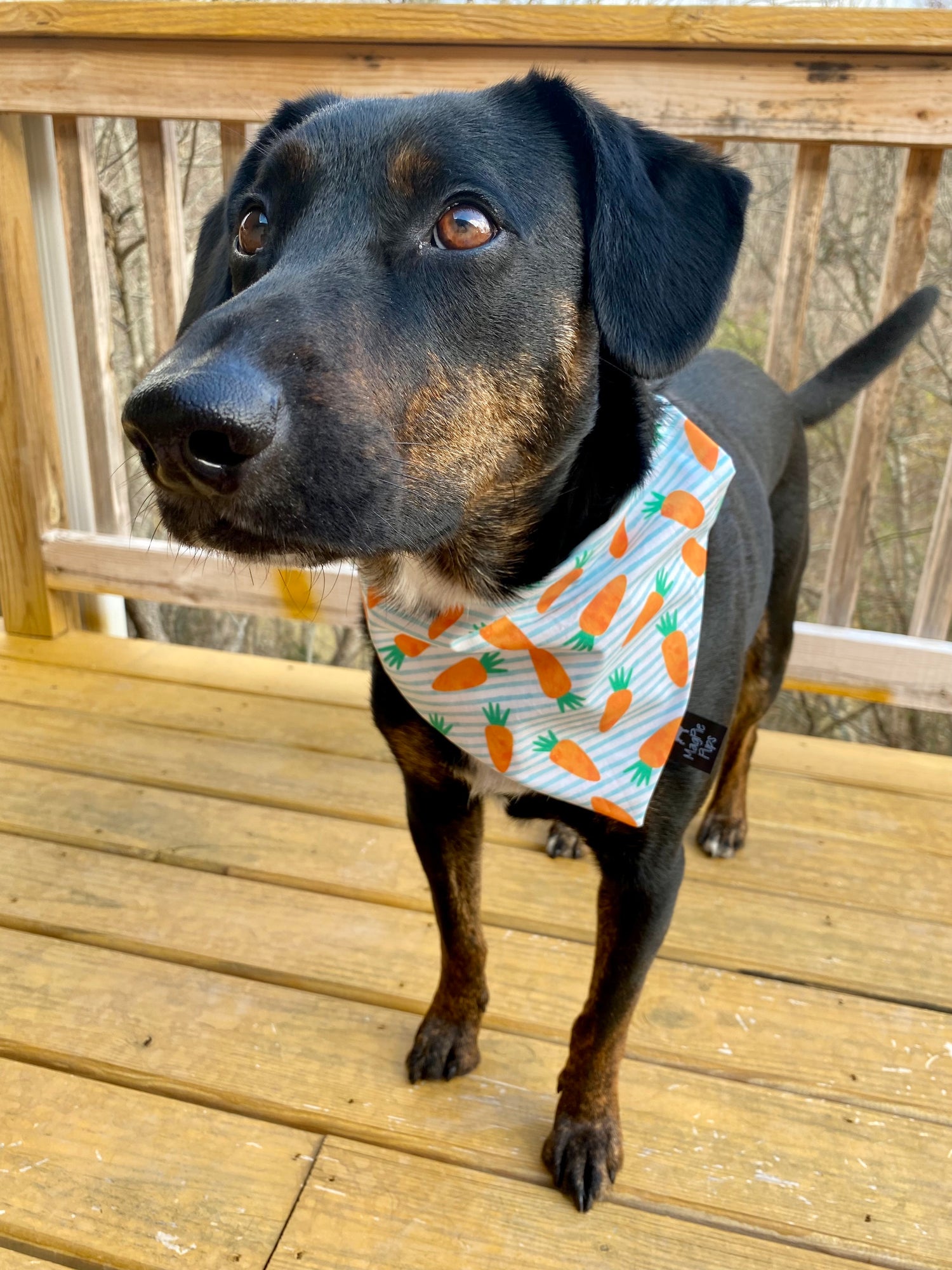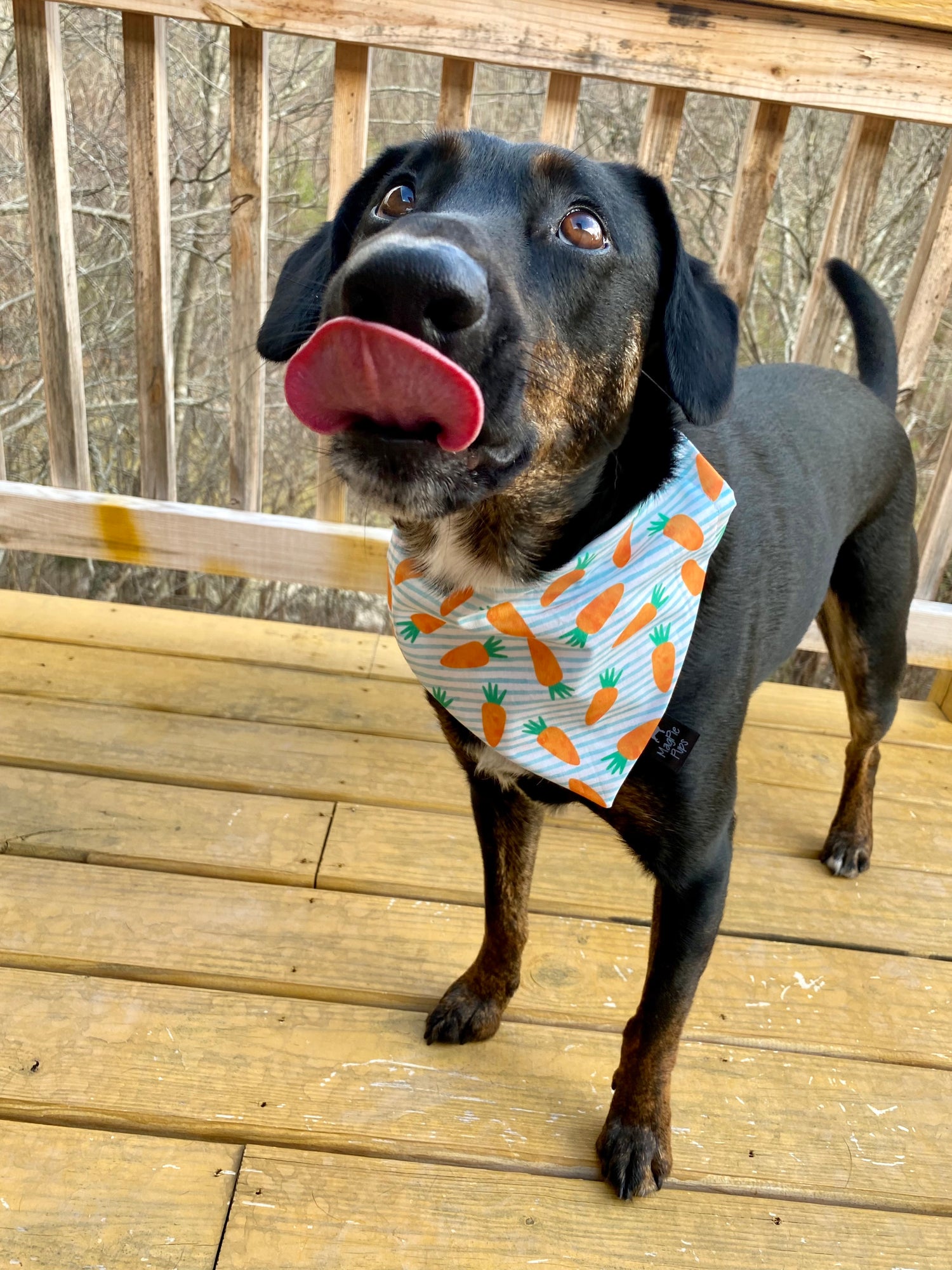 This over the collar bandana is a light blue and white striped bandana with orange carrots printed on it.