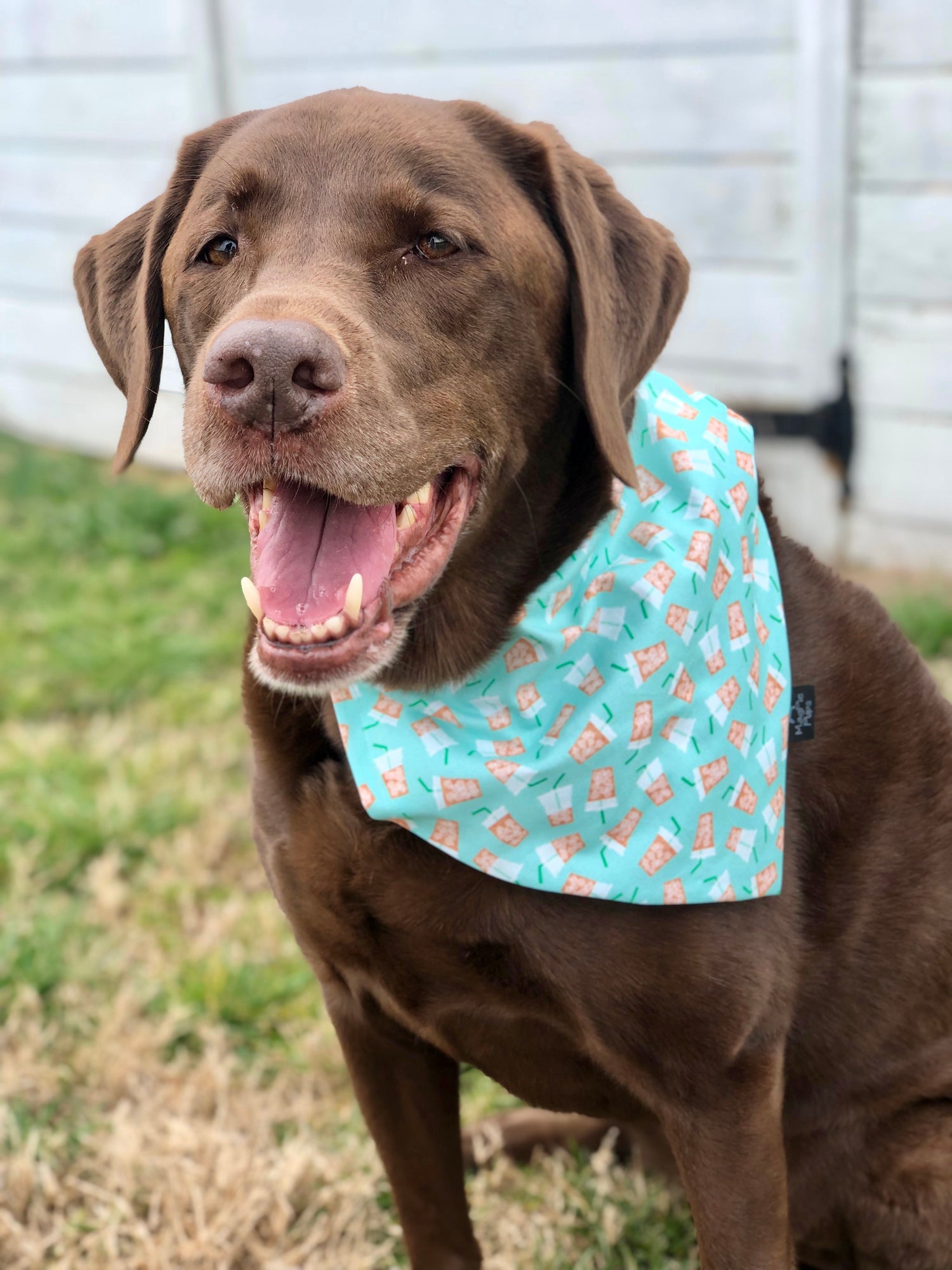 This over the collar bandana is a mint green bandana with iced coffee cups printed on it.