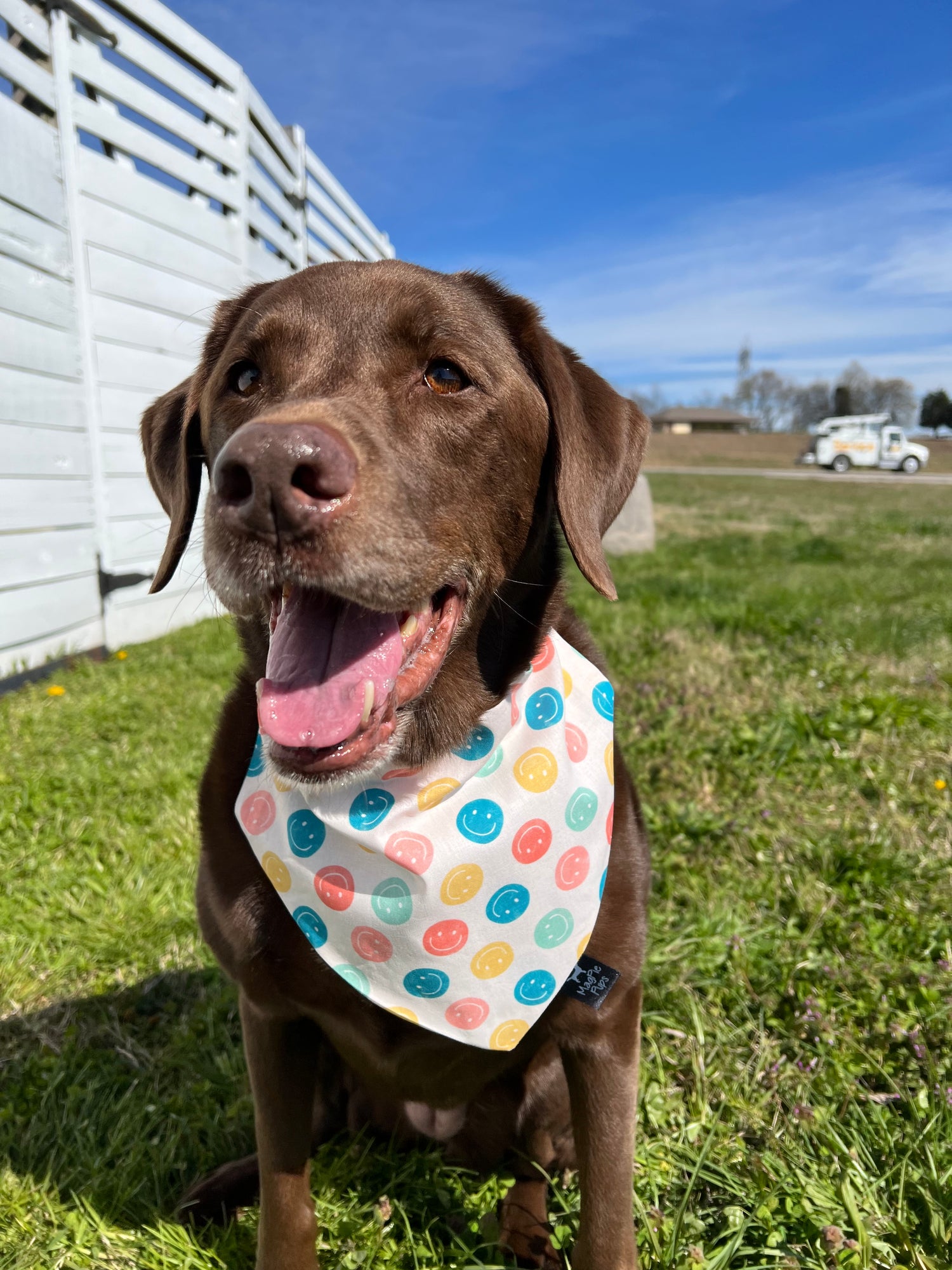 This bandana is an off white bandana with classic smiley faces printed on it in mint, blue, pink, and yellow.