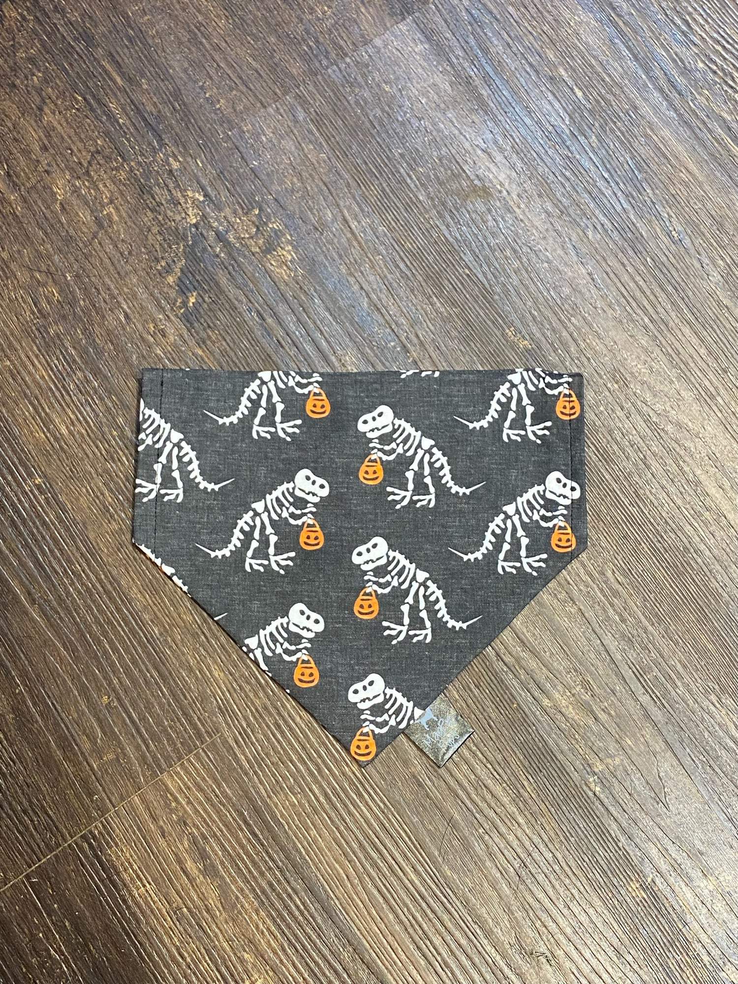 This bandana is a black bandana white white trick or treating t-rex skeletons printed on it.