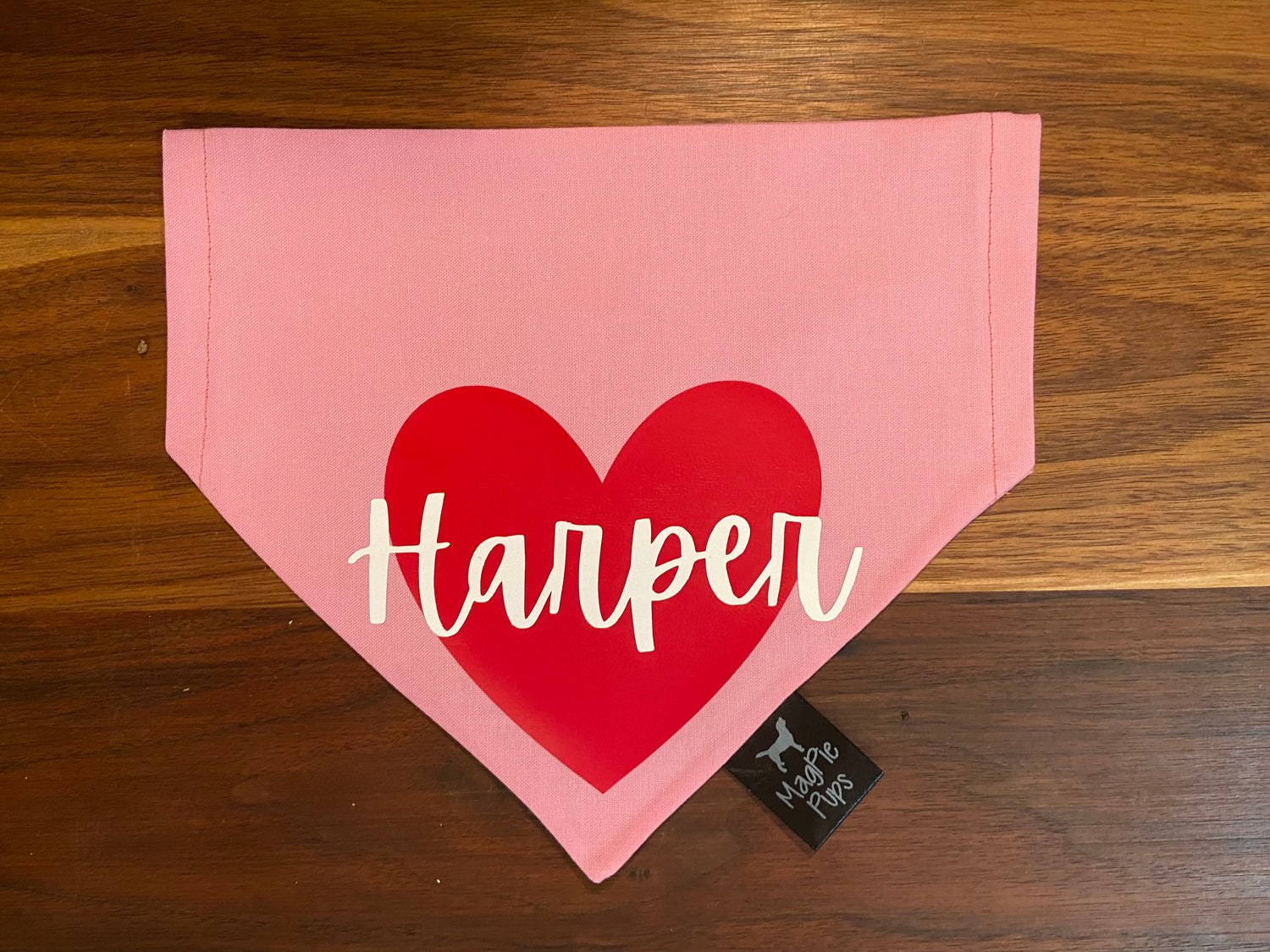 This bandana is available in 2 different color options: red with a pink heart and white writing or pink with a red heart and white writing.