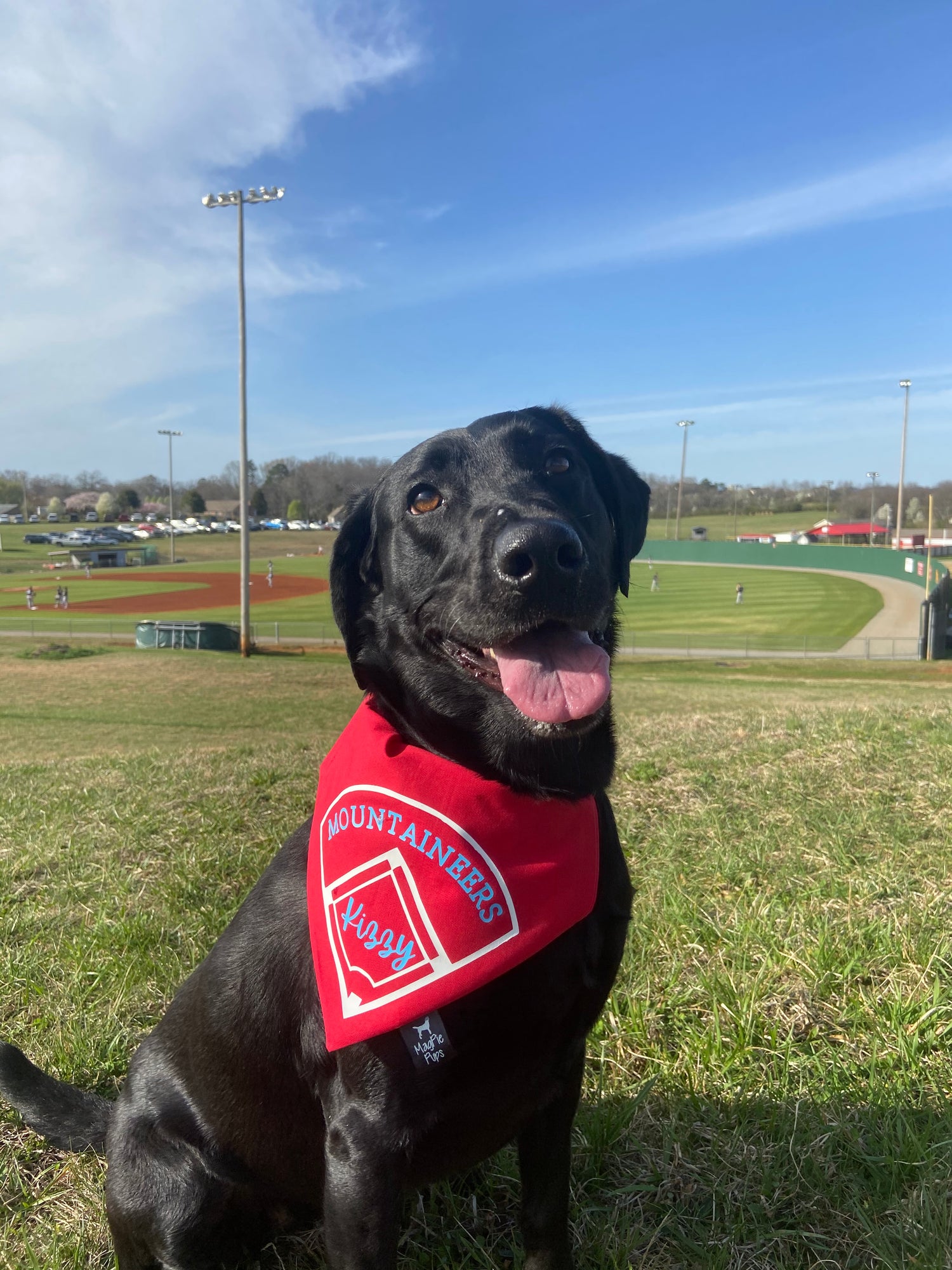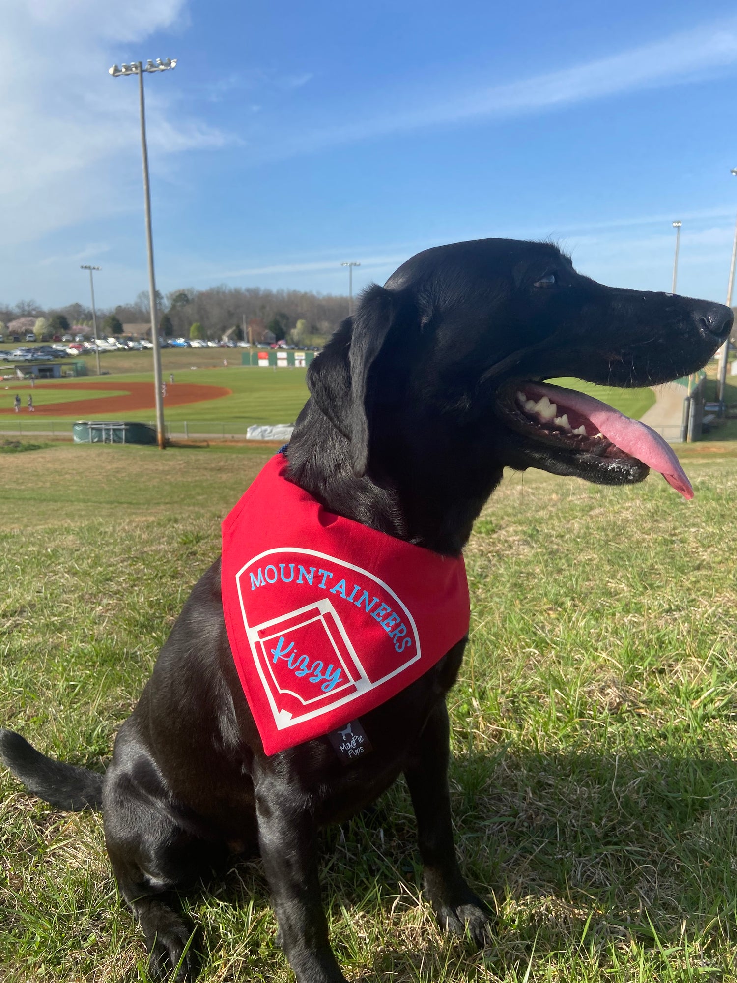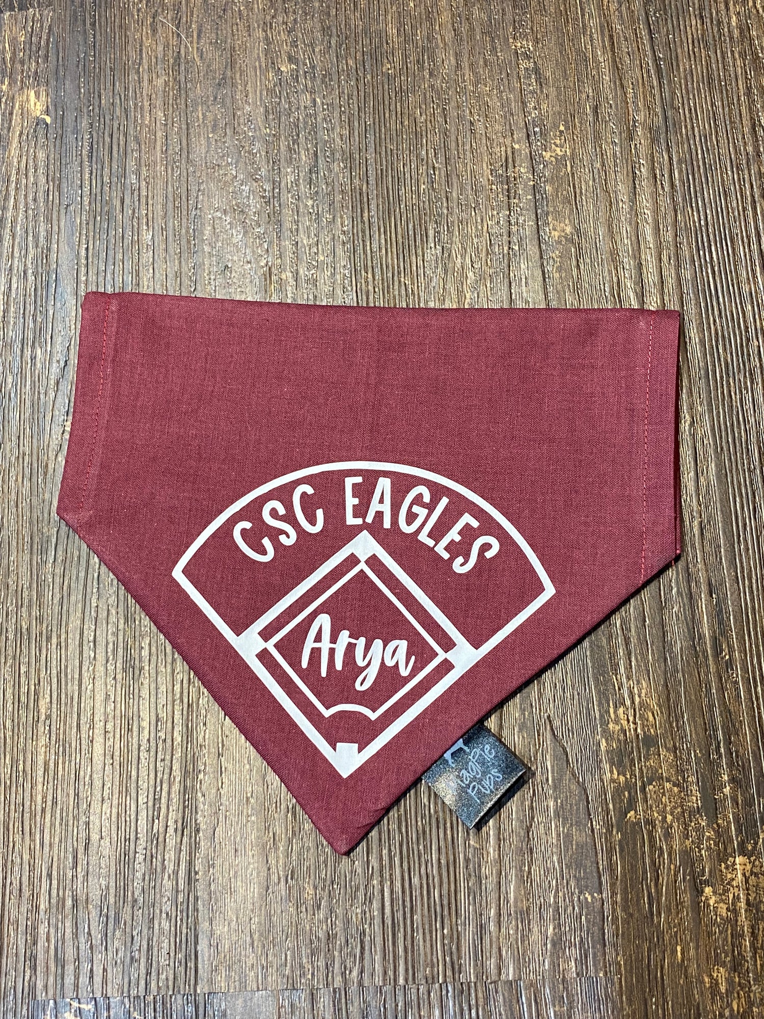 This bandana is customizable with any solid color fabric. It has a baseball/softball field on it in vinyl. You can add your pup's name in the infield and your team name/mascot/etc. in the outfield. Please specify what you would like for each in the personalization section. Please also specify what you would like the colors to be for the vinyl.