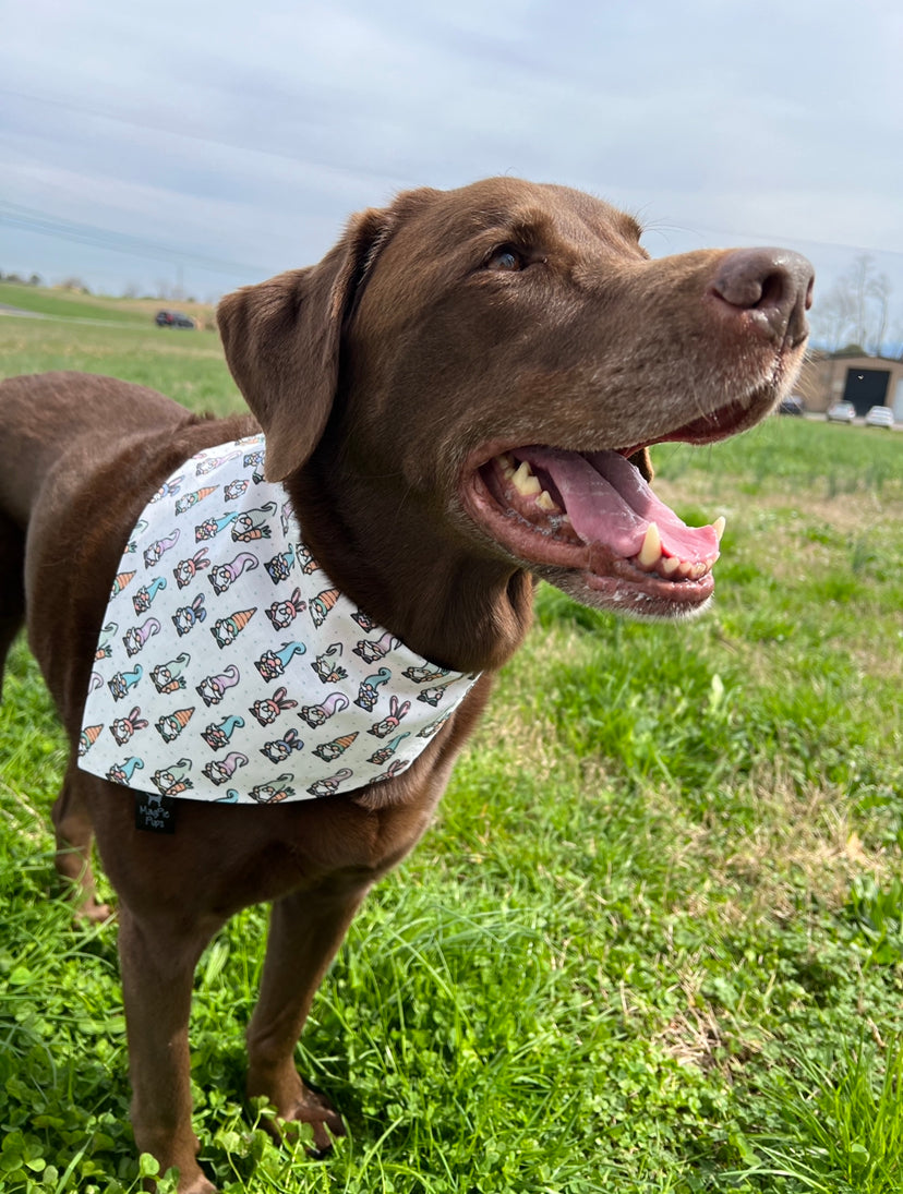This over the collar bandana is a white bandana with pastel gnomes holding Easter eggs printed on it.
