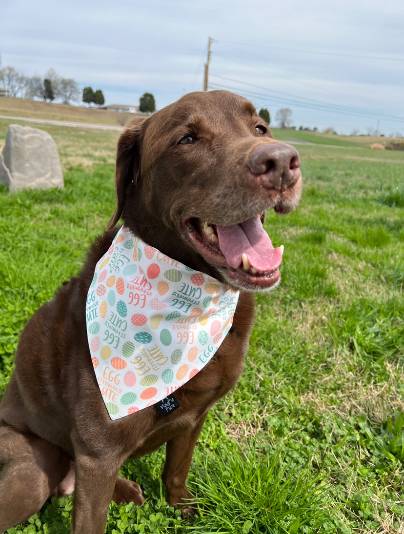 This over the collar bandana is a white bandana with pastel Easter eggs and the words "Egg Stremely Cute" printed on it.