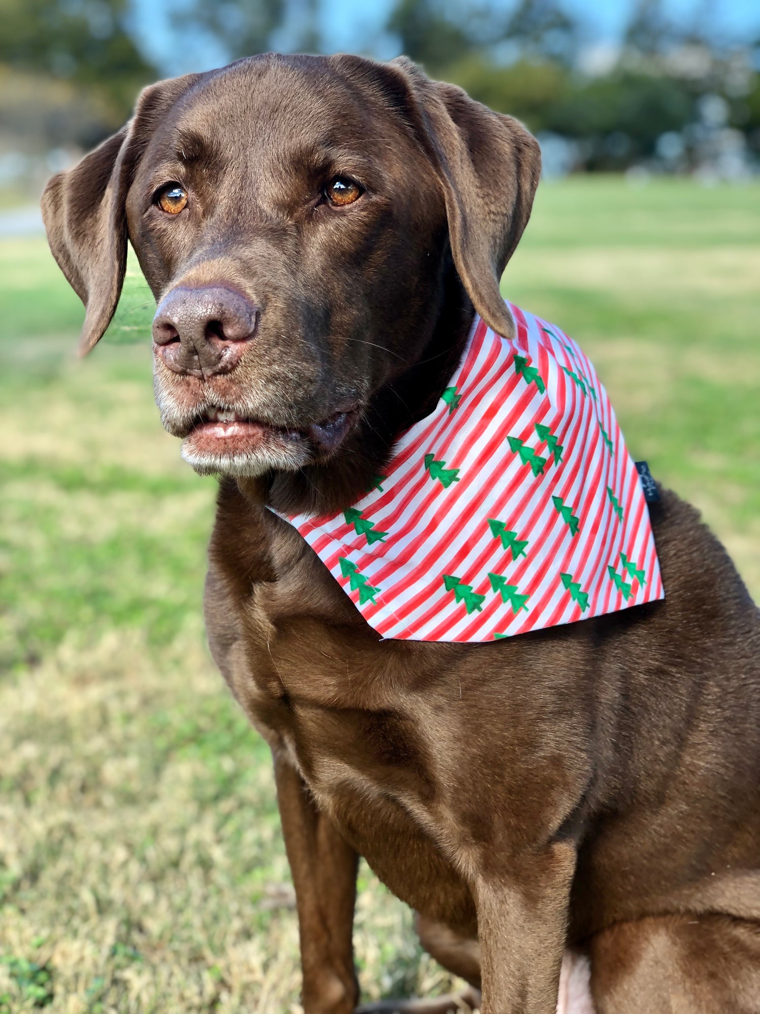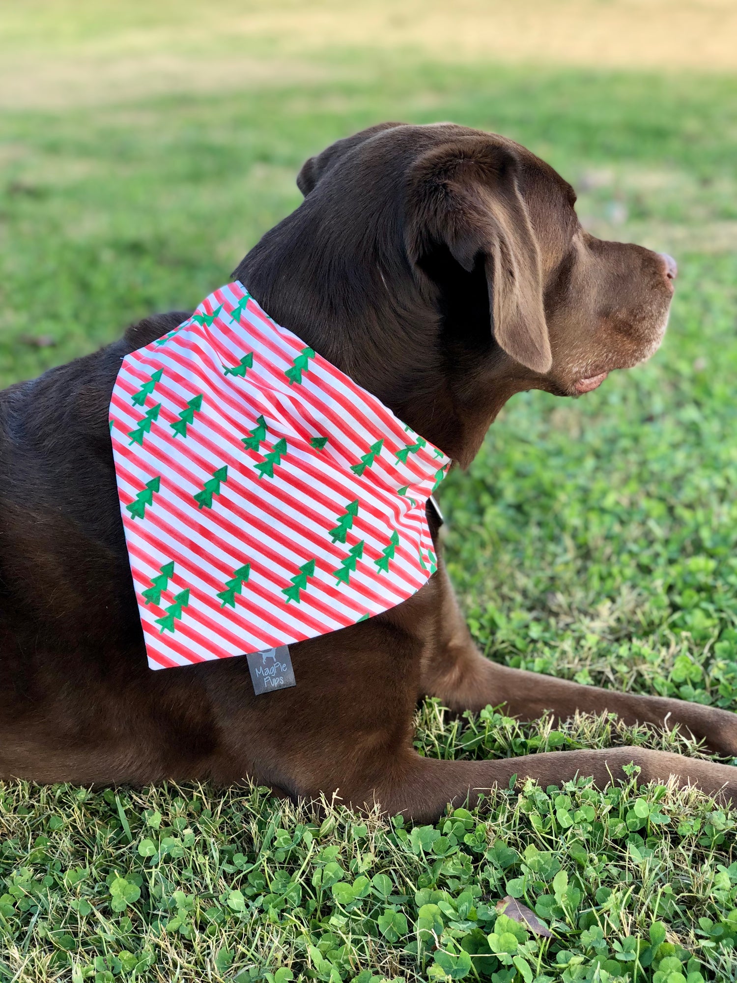 The same fabric is on the back and front, and design placement may vary on each bandana. These bandanas have openings between the front and the back of the bandana for a collar to slip through. This allows your pup to play freely without having anything tied around their necks. A collar is require to wear this bandana.