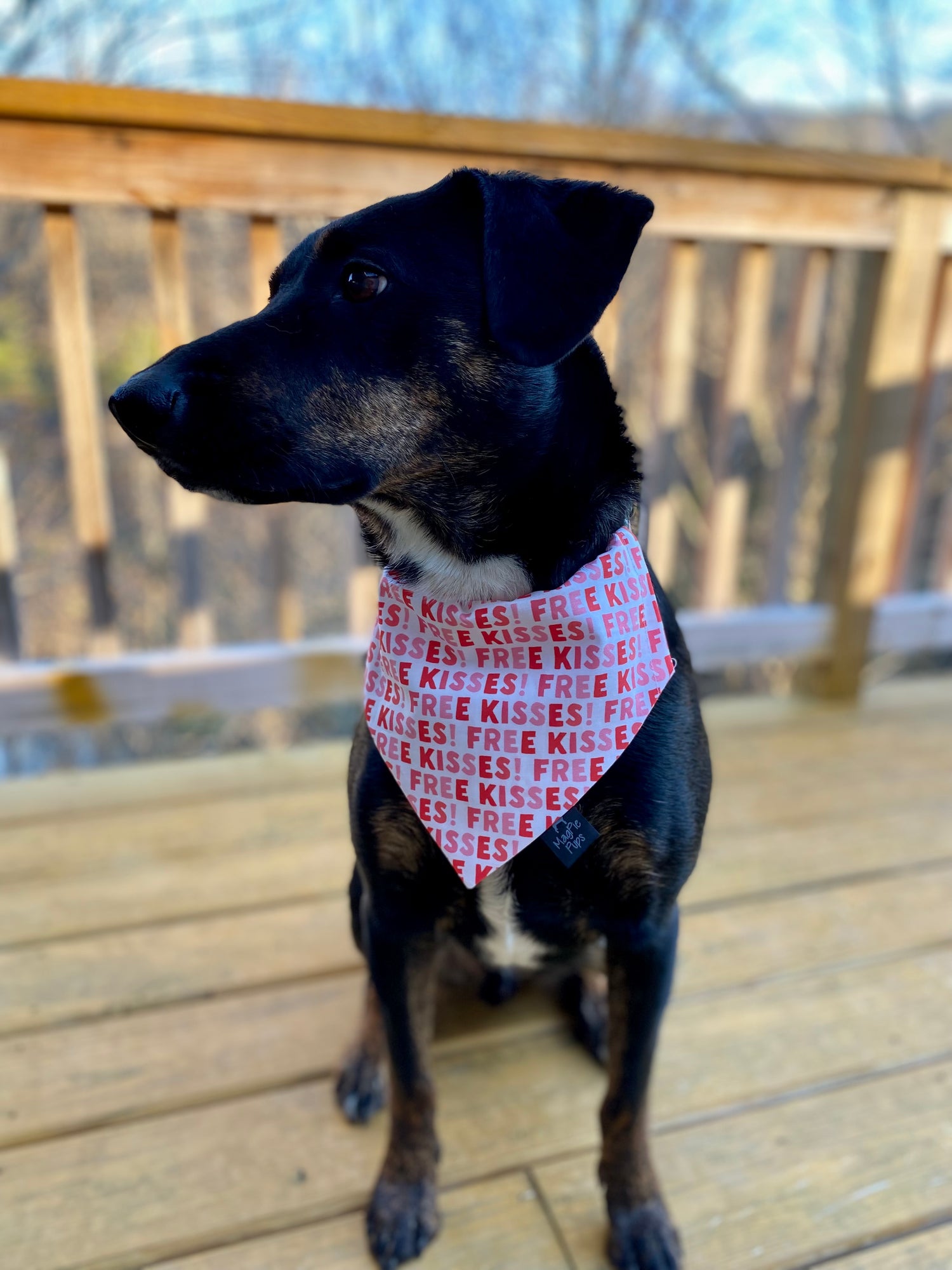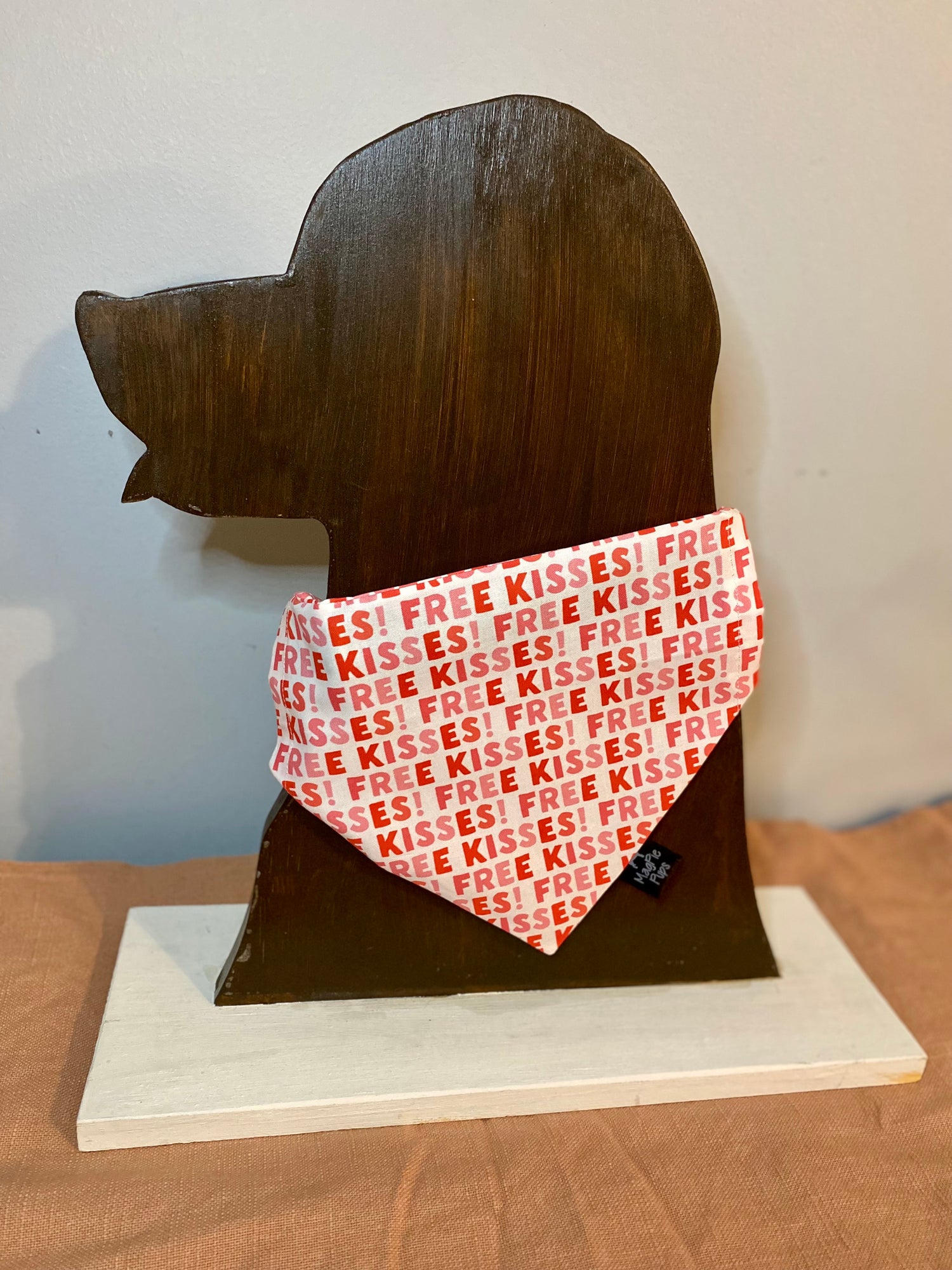 This bandana is a white bandana with Free Kisses! printed on it in red and pink letters.
