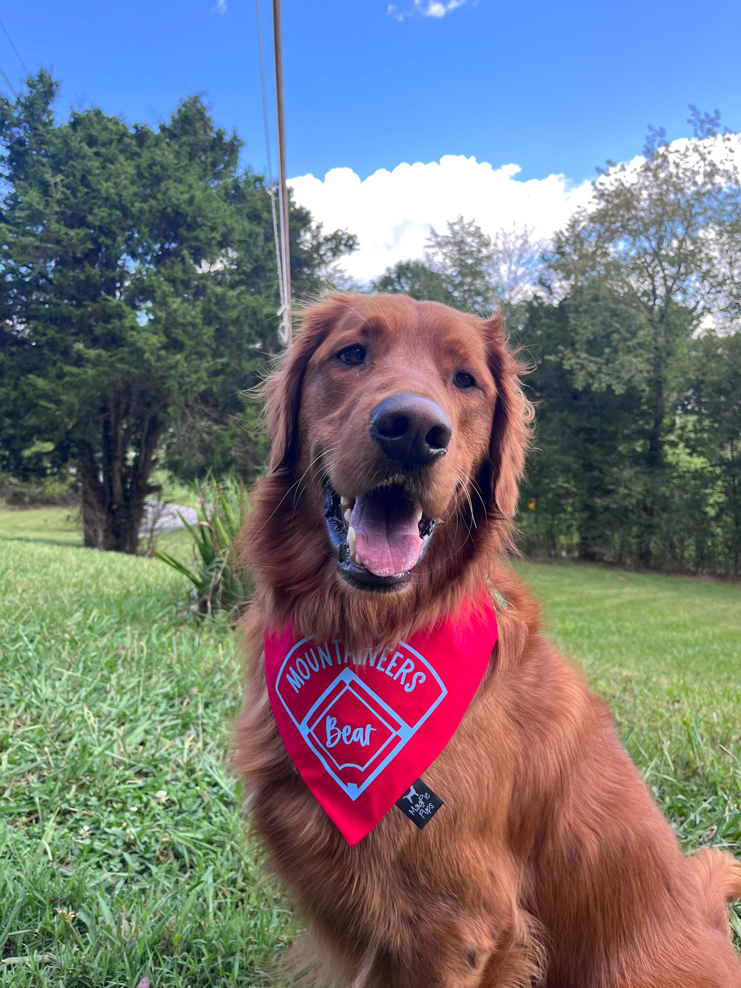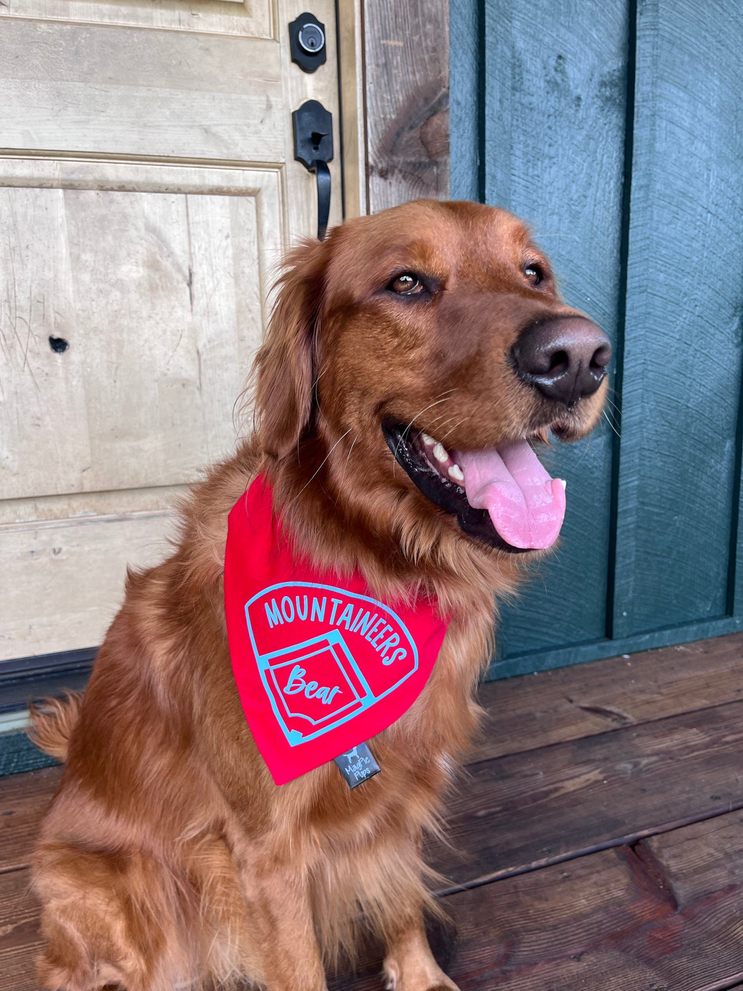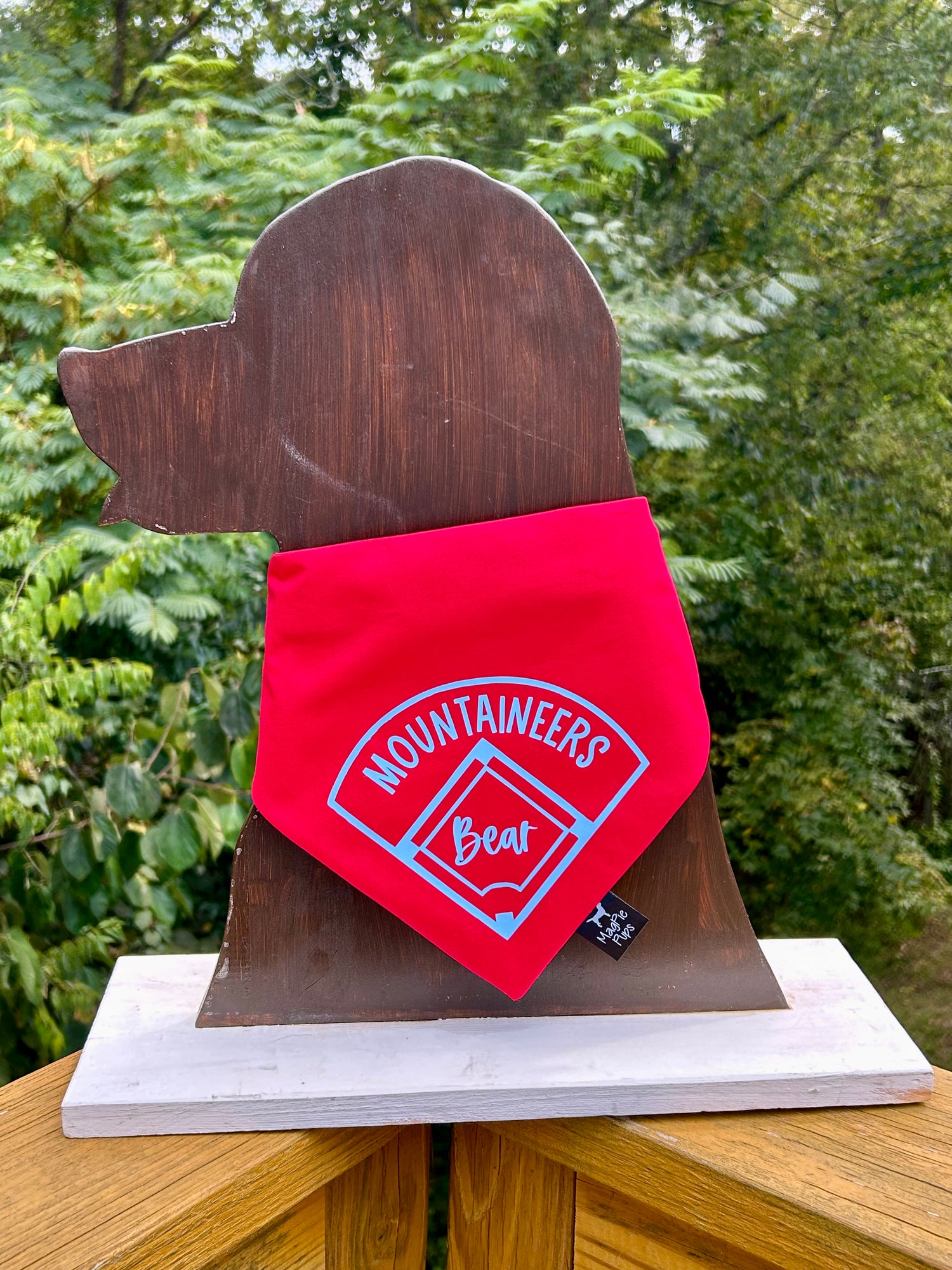 This bandana is a red bandana with a light blue mountaineers baseball/softball field printed on it. This bandana can be customized with your dog's name.