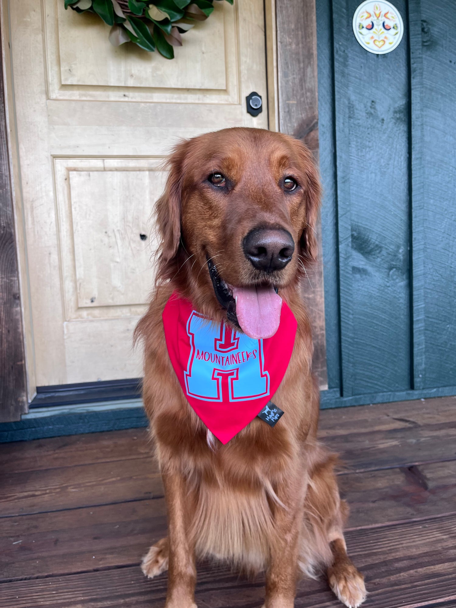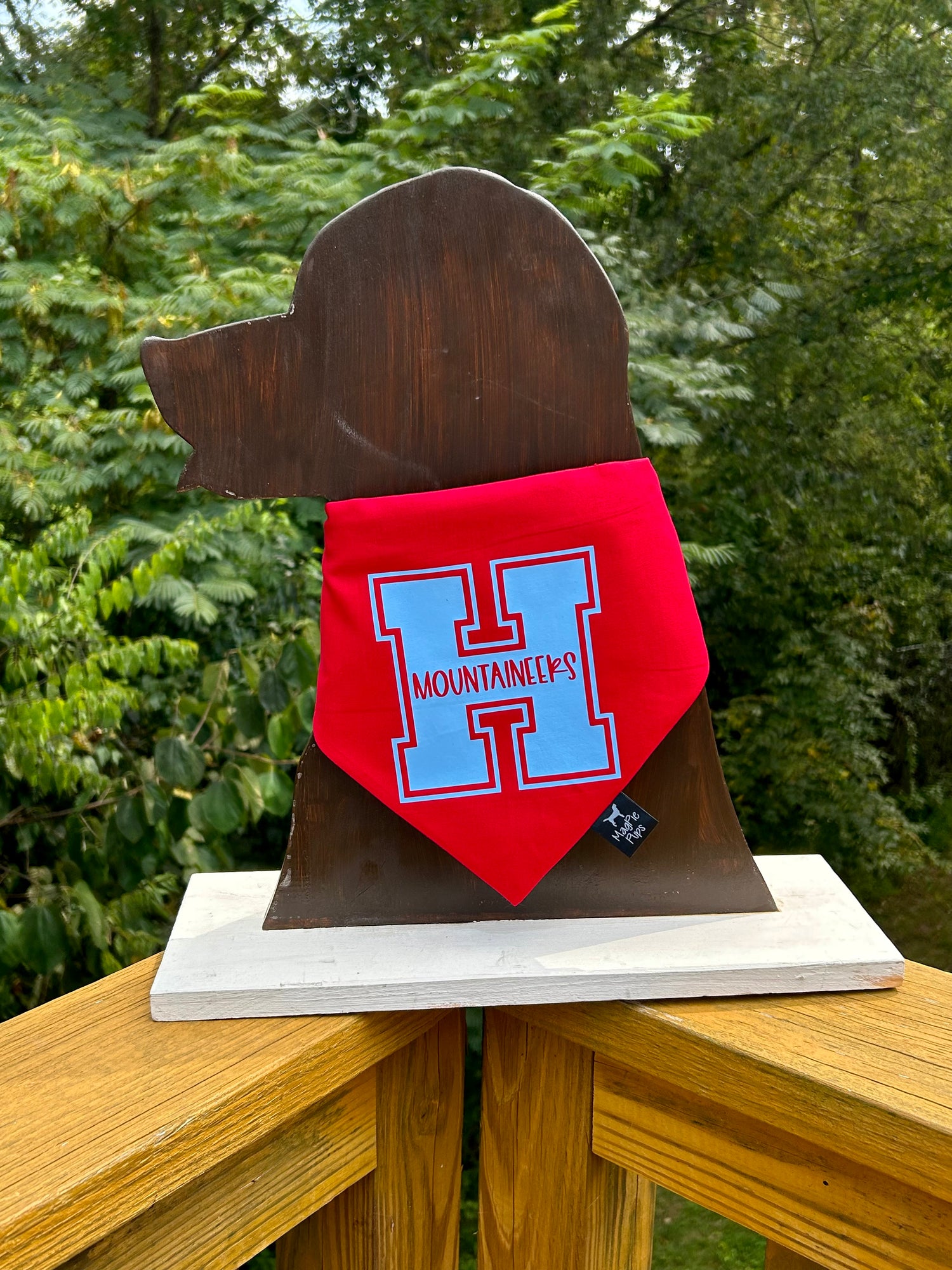 This bandana is a red bandana with a light blue mountaineers H printed on it.
