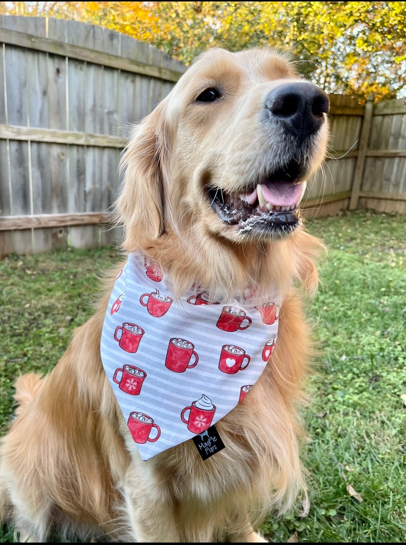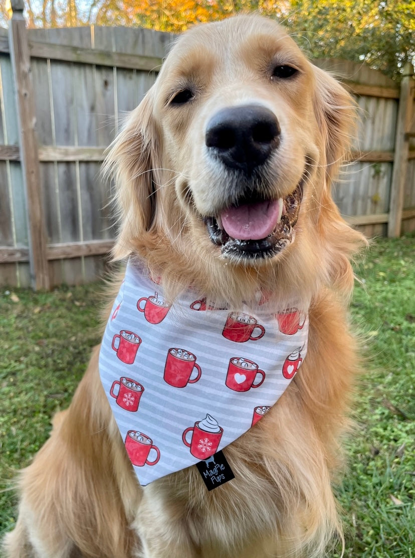 This bandana is grey and white stripes with red mugs of hot chocolate printed on it.