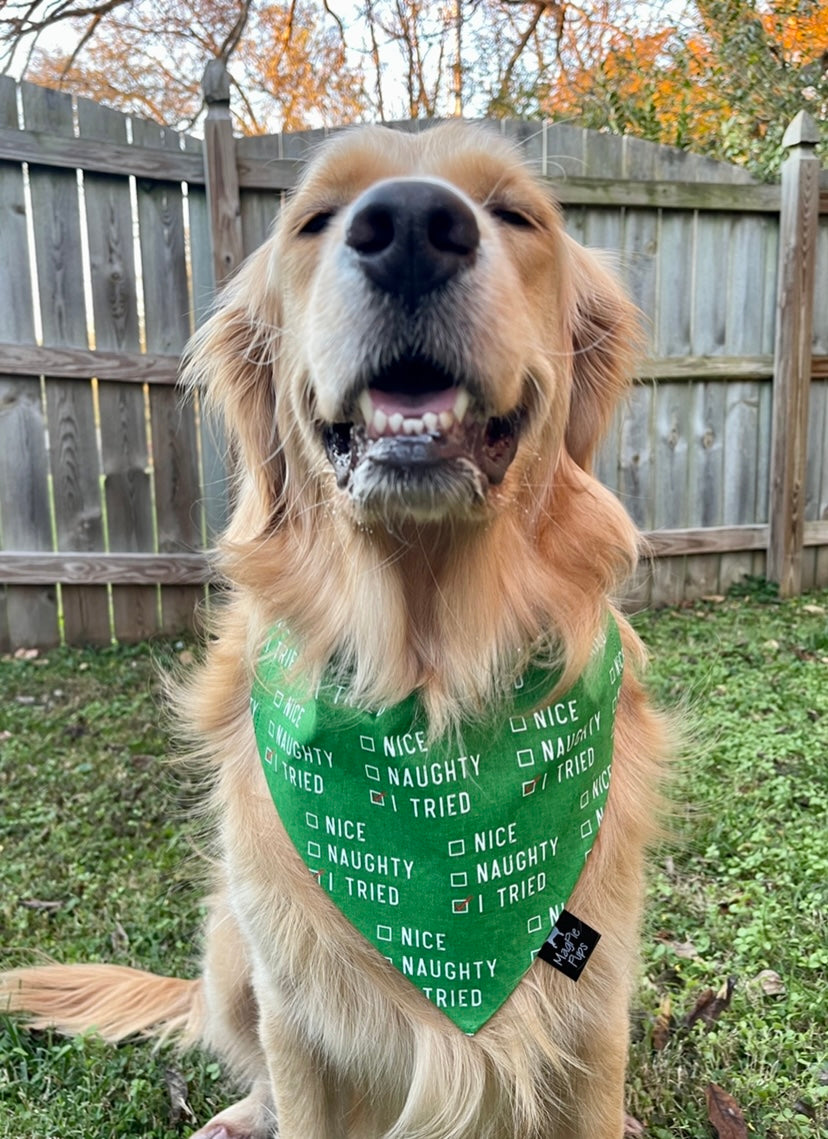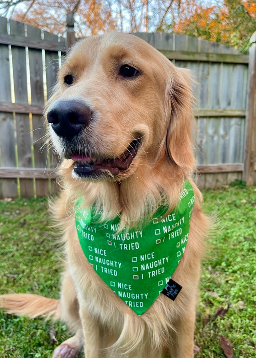 This bandana is green with the words "Naughty" "Nice" and "I tried" printed on it.