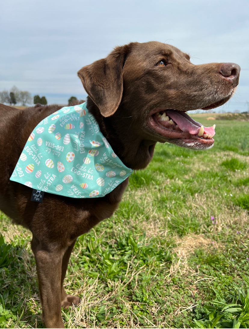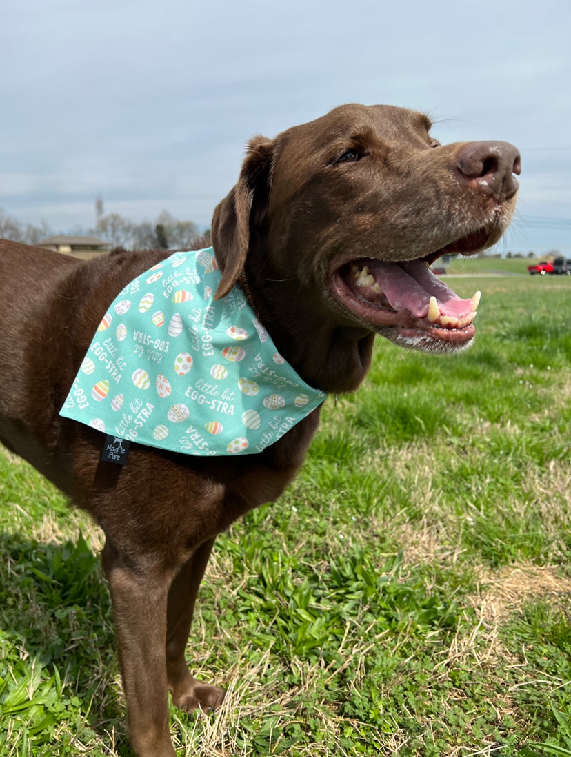 This over the collar bandana is a mint green bandana with Easter eggs and the words "Little Bit Egg-Stra" printed on it.