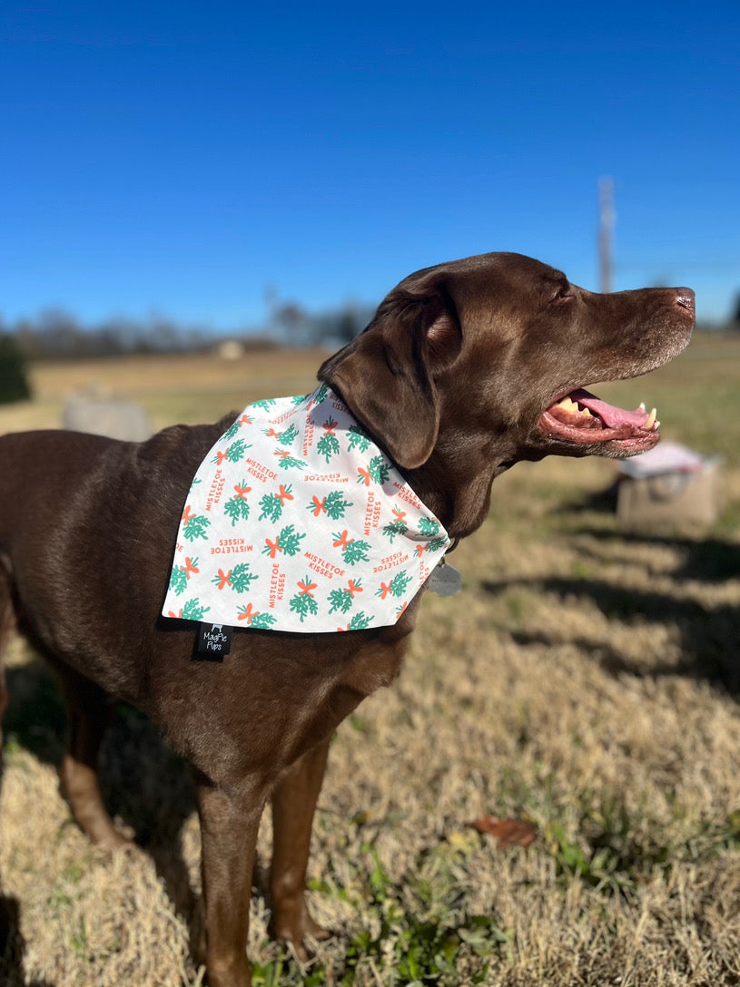 This bandana is a white bandana with "mistletoe kisses" and mistletoe printed on it in Christmas colors.
