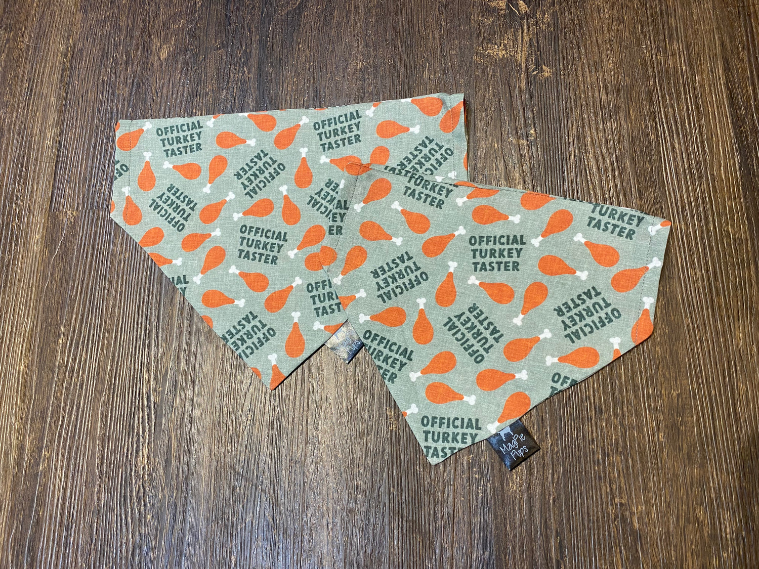 This bandana is a sage green bandana with turkey legs and “official turkey tester” printed on it
