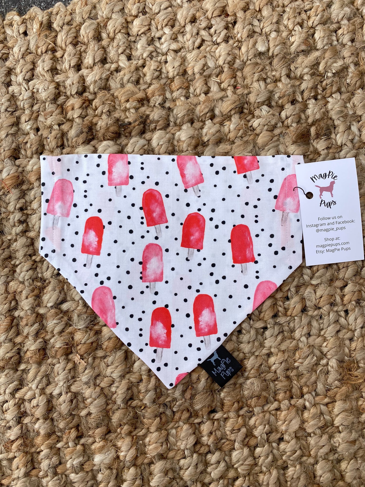 The same fabric is on the back and front, and design placement may vary on each bandana. These bandanas have openings between the front and the back of the bandana for a collar to slip through. This allows your pup to play freely without having anything tied around their necks. A collar is require to wear this bandana.