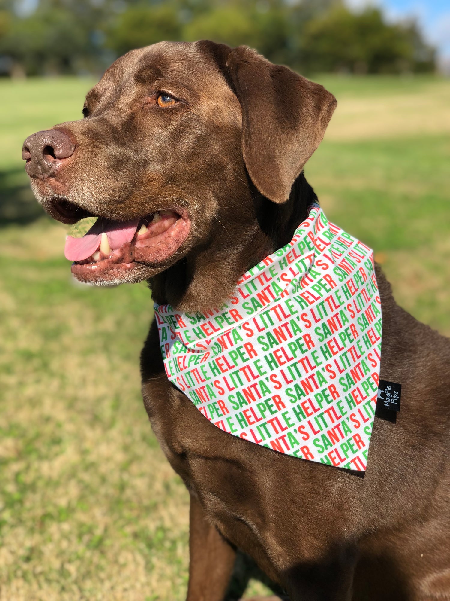 This bandana is white bandana with green and red writing "Santa's Little Helper."