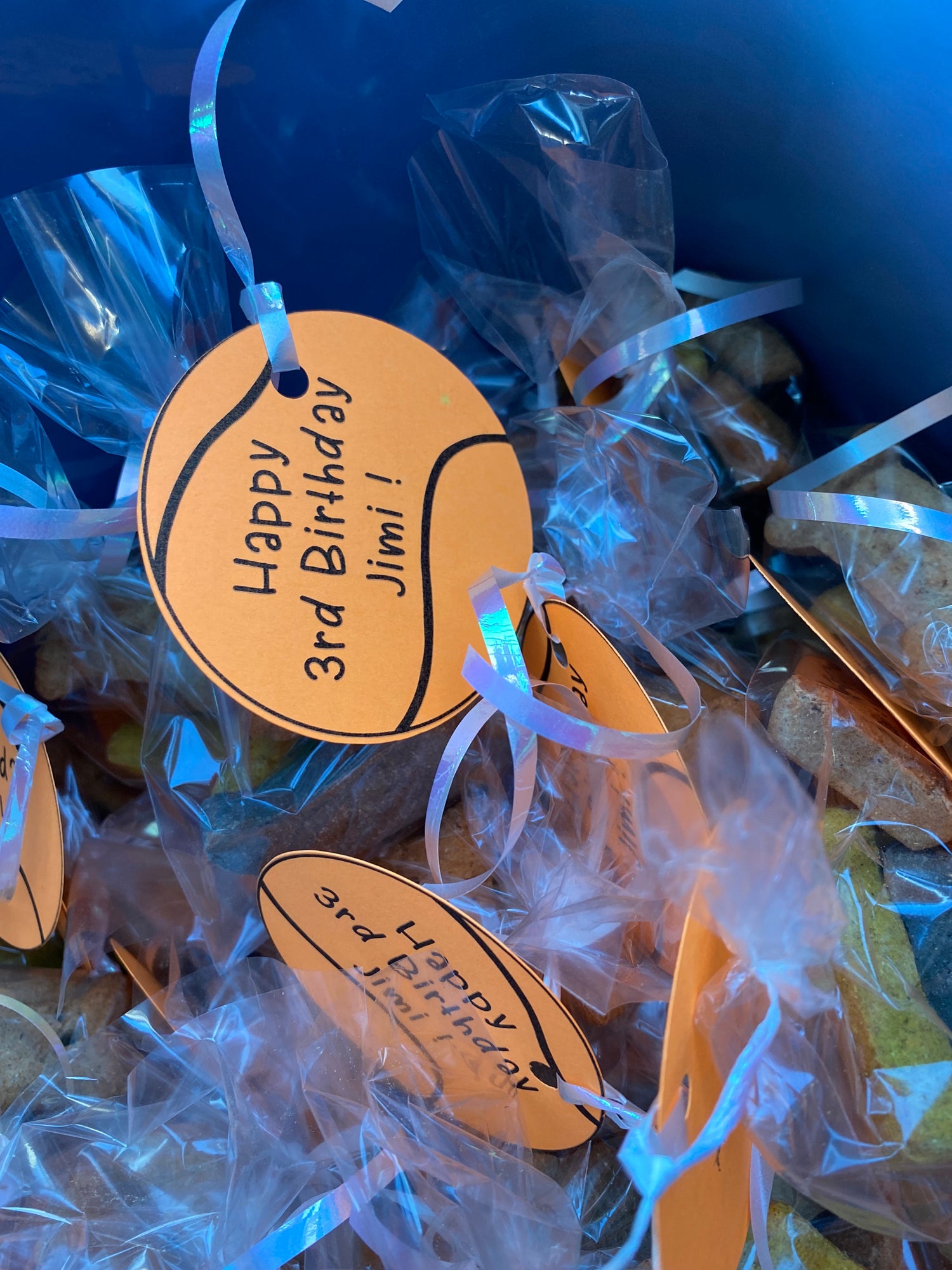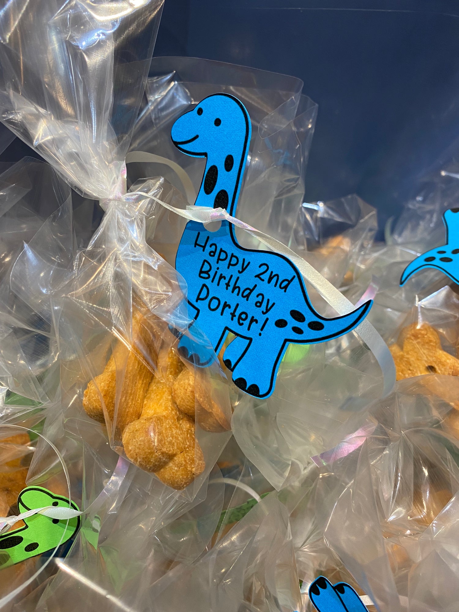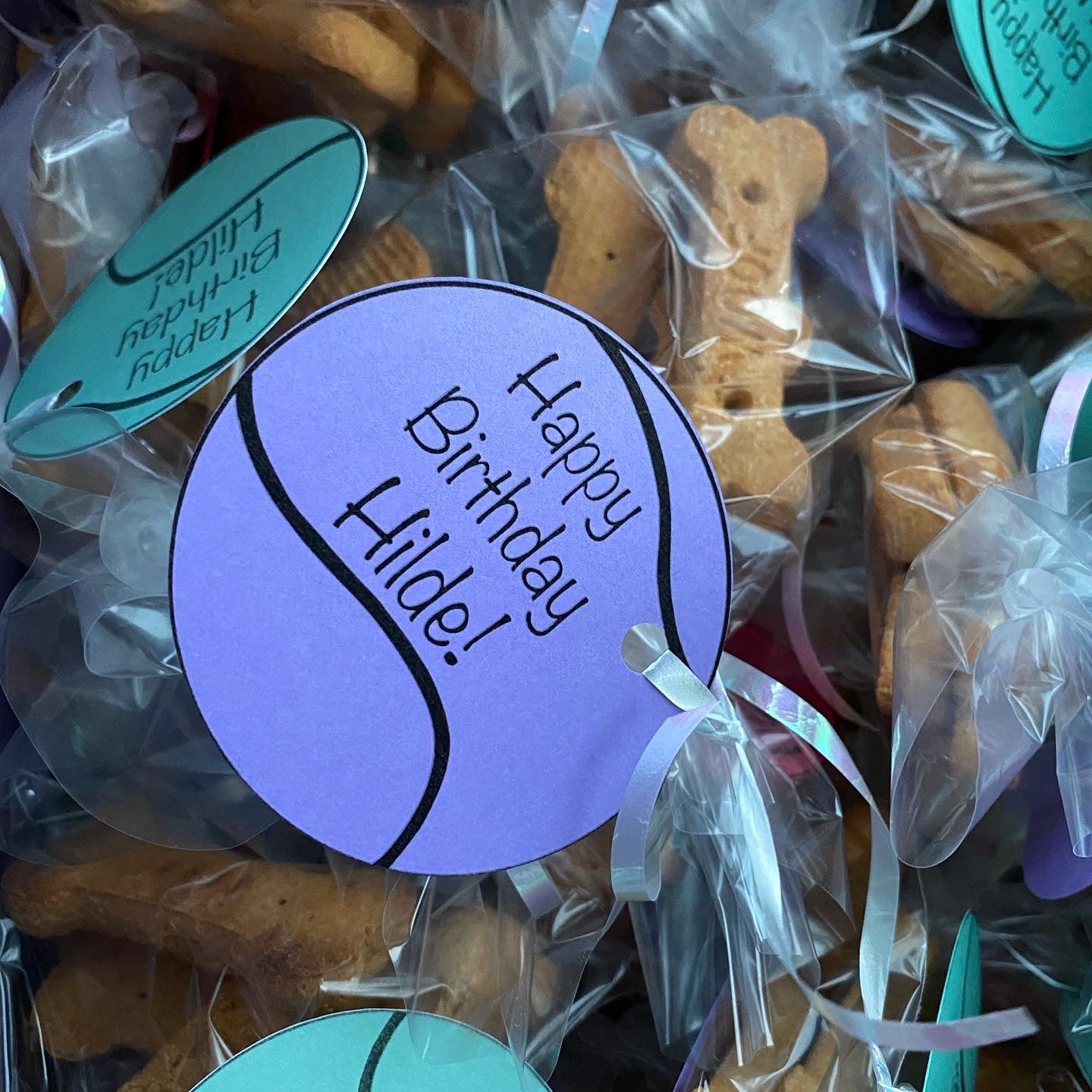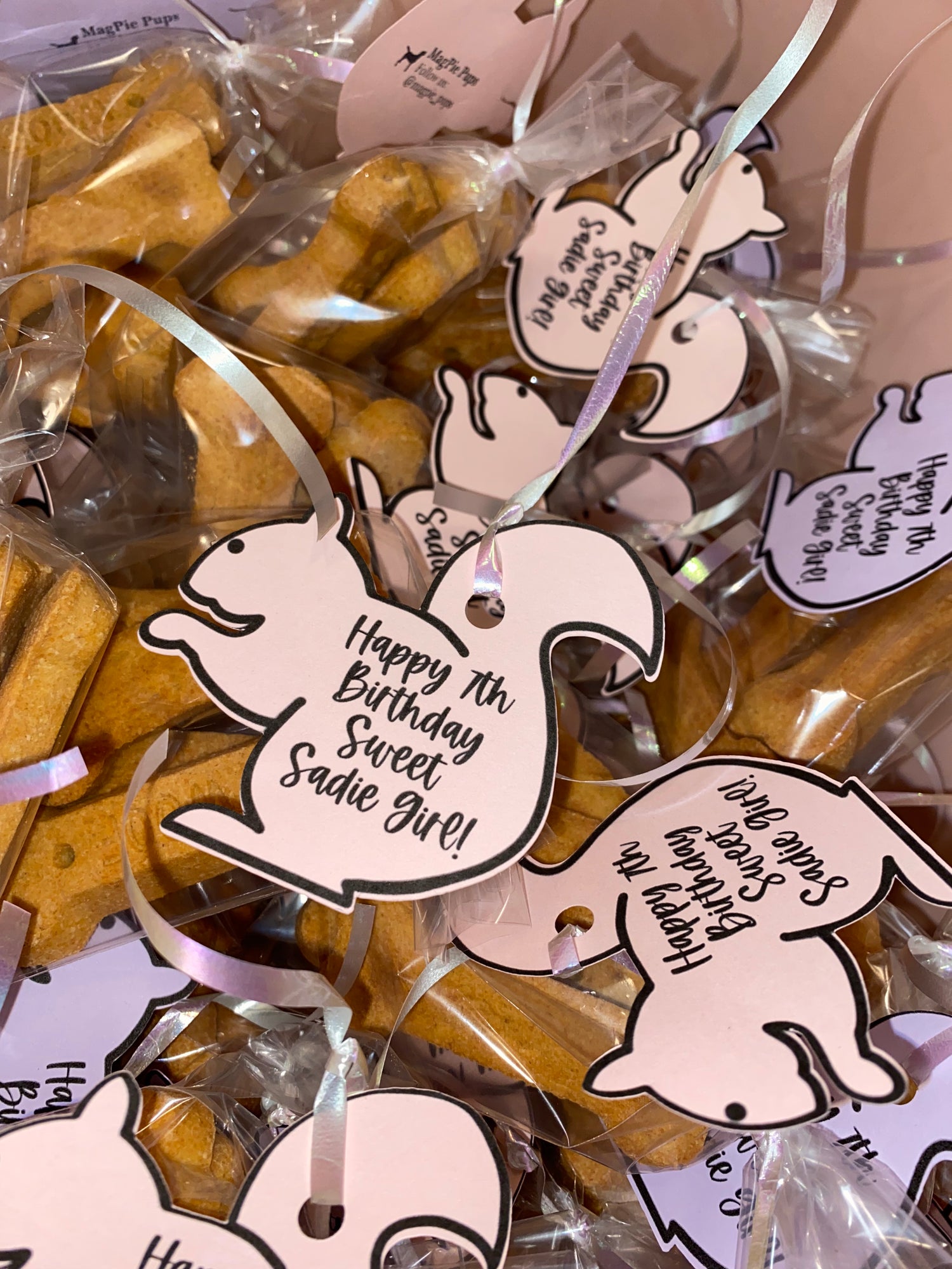 Birthday Party Kits and Holiday Treat Bag Kits come with everything you need to make your pup's party special! These kits include custom tags that we make, treat bags, and ribbons. You just have to put your pet's favorite treats in the bags!