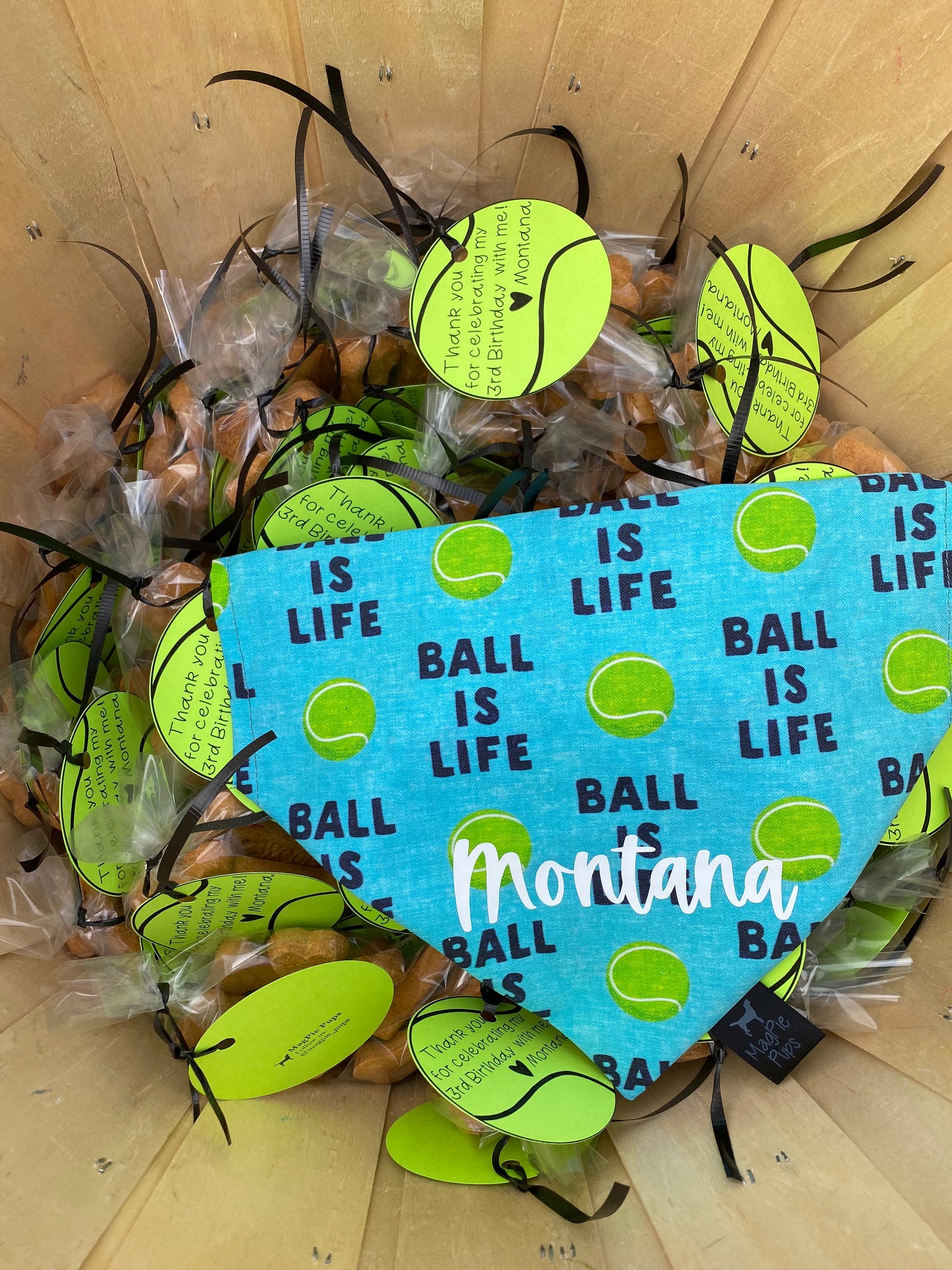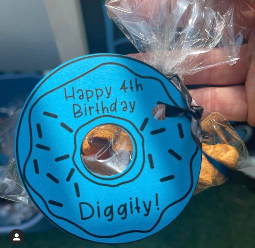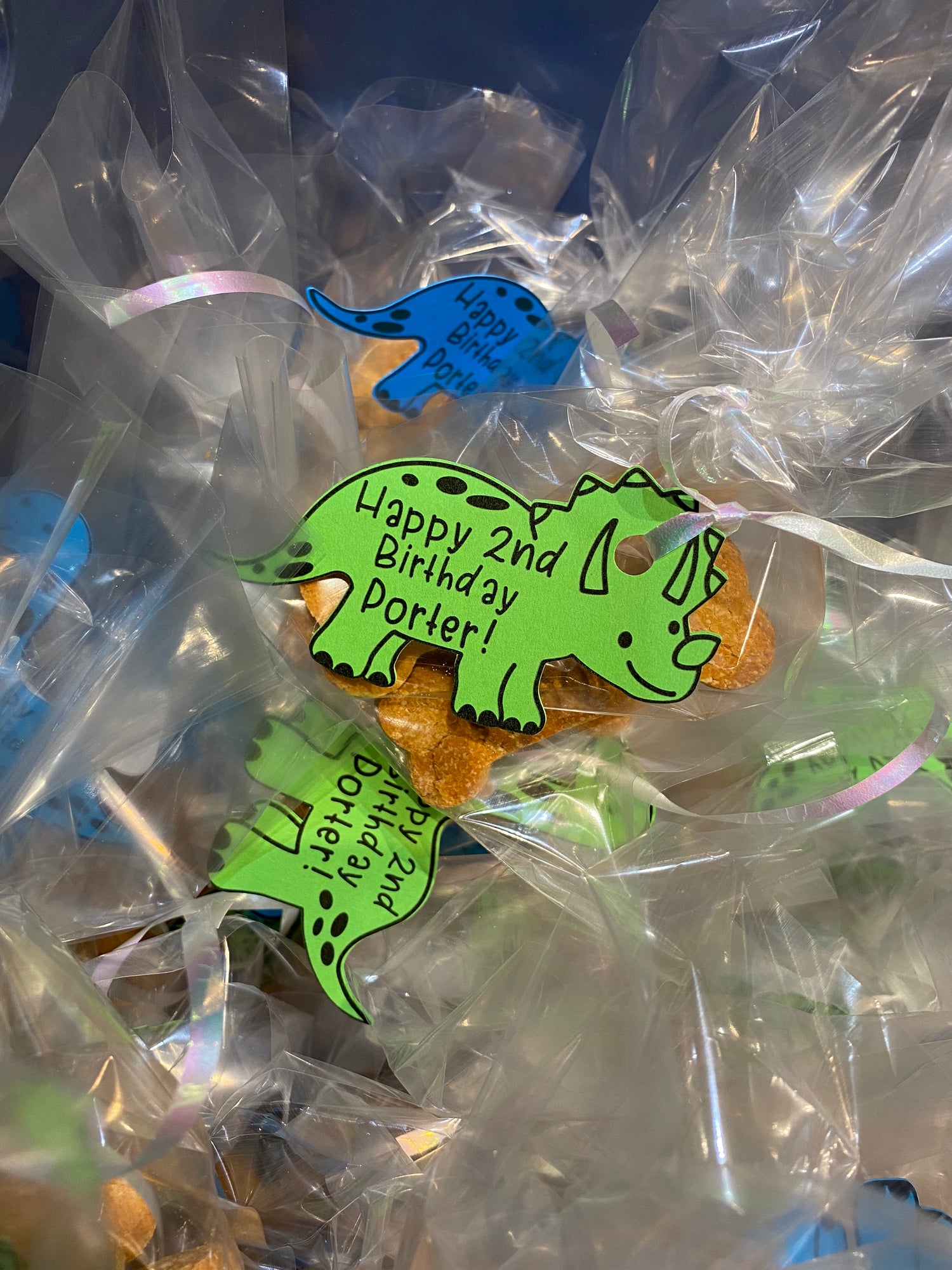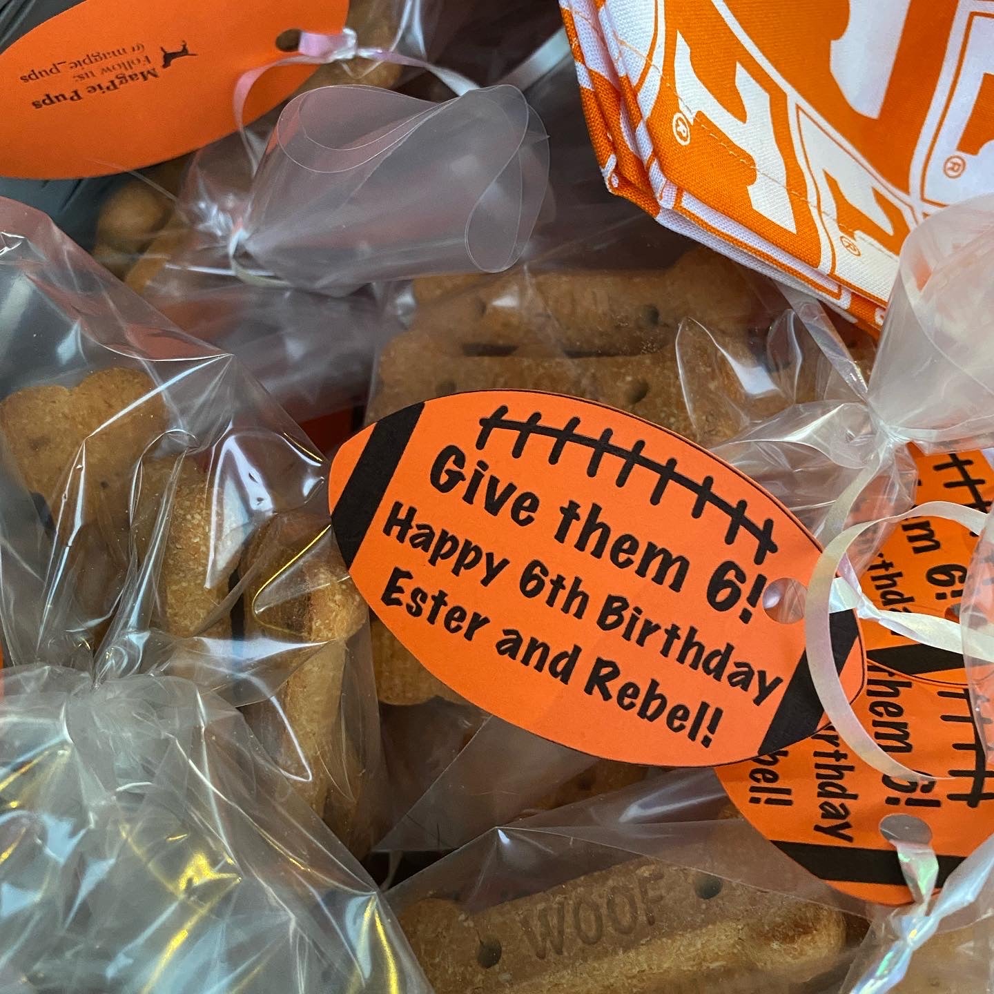 Birthday Party Kits and Holiday Treat Bag Kits come with everything you need to make your pup's party special! These kits include custom tags that we make, treat bags, and ribbons. You just have to put your pet's favorite treats in the bags!